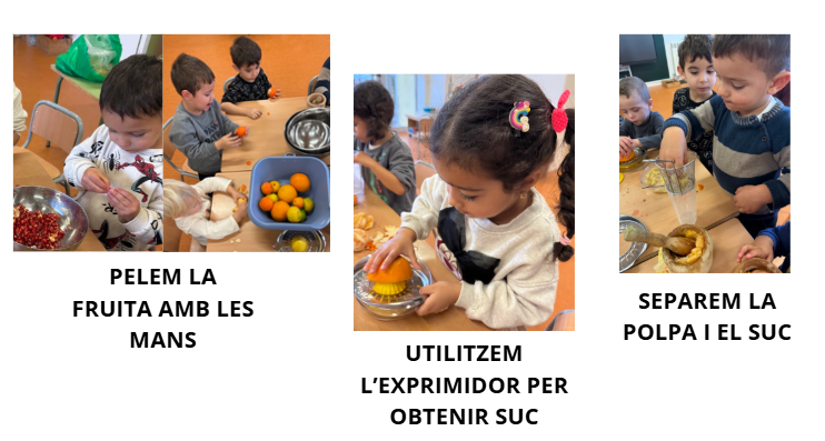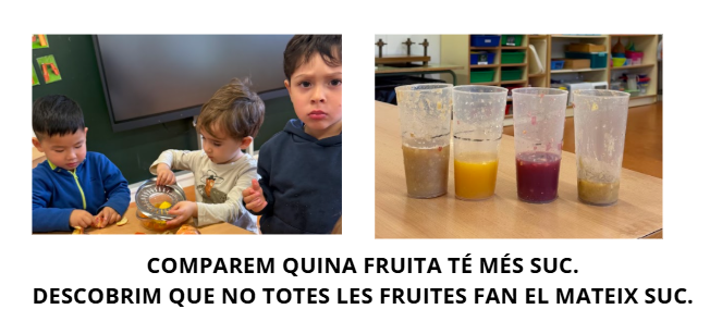 A l’aula vam tastar diferents fruites i vam parlar sobre quines agradaven més, com eren, quin gust tenien i si sortia suc en mossegar-les. A partir de preguntes de la mestra com “La magrana té suc?” o “I la taronja?”, van sorgir respostes diverses, contradiccions i moltes ganes de saber-ne més.
