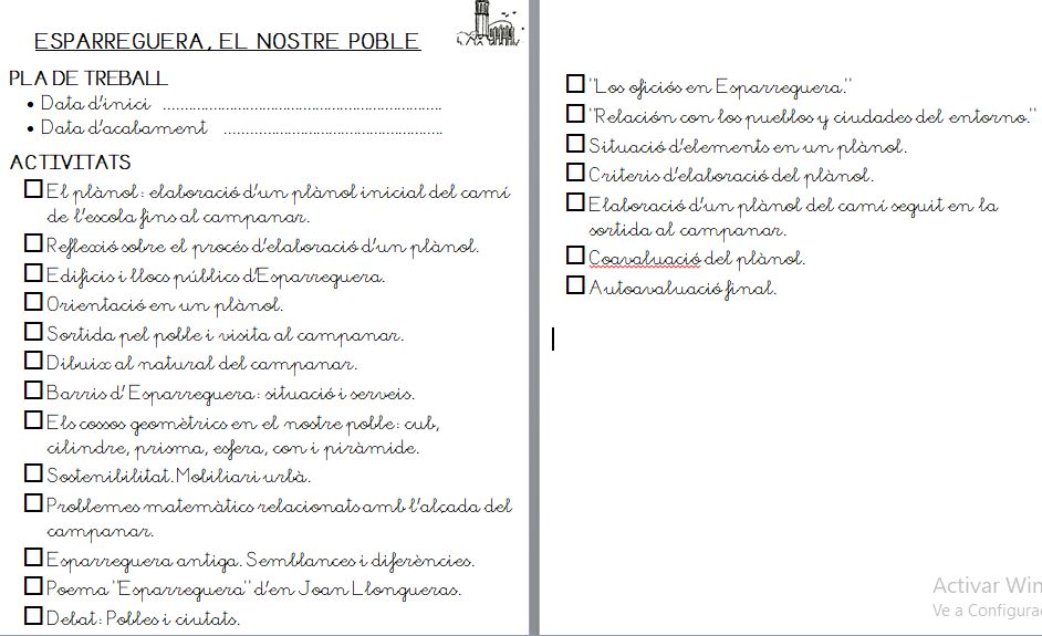 Per desenvolupar aquests continguts es treballa amb fotografies i plànols, i es realitzen sortides pel poble. Una de les sortides, la visita guiada al campanar, és el motor del desenvolupament d’aquest projecte. Han de realitzar un plànol amb l’itinerari seguit per anar des de l’escola al campanar, per això els caldrà el coneixement de la ubicació de diferents edificis que són referents, l’orientació i les distàncies.