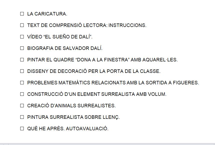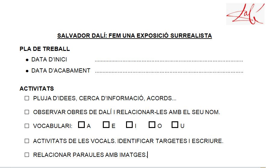 - Mostrar interès i curiositat per descobrir, gaudir i participar quan se li ofereixen reproduccions d’obres de Dalí.