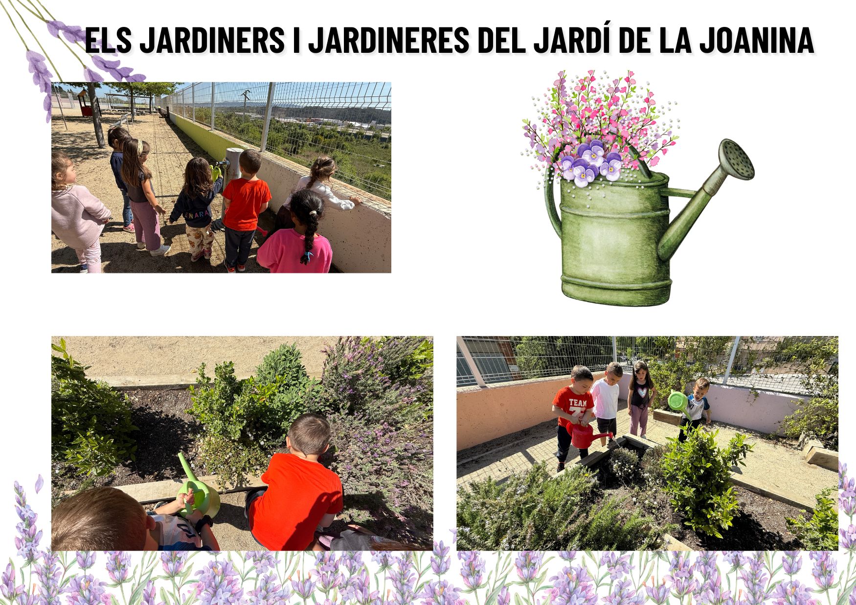 Els infants, plens d’entusiasme, es preparen per donar vida al jardí de la Joanina. Amb il·lusió, imaginen com aviat les papallones, les marietes i les abelles vindran a omplir de color i moviment el seu petit refugi verd.