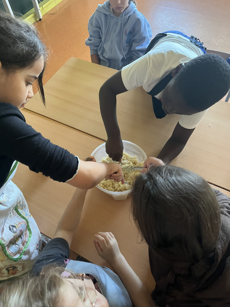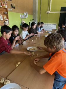 La classe de quart va aprofitar el dia de la Castanyada per baixar a la cuina de l’escola i elaborar panellets de tota mena. Amb molta il·lusió, van mesurar, pastar i donar forma a les seves creacions, descobrint els ingredients tradicionals i gaudint del treball en equip. L’activitat va permetre als infants aprendre sobre la tradició gastronòmica d’aquesta festa i, alhora, compartir una estona molt dolça amb els companys i companyes.