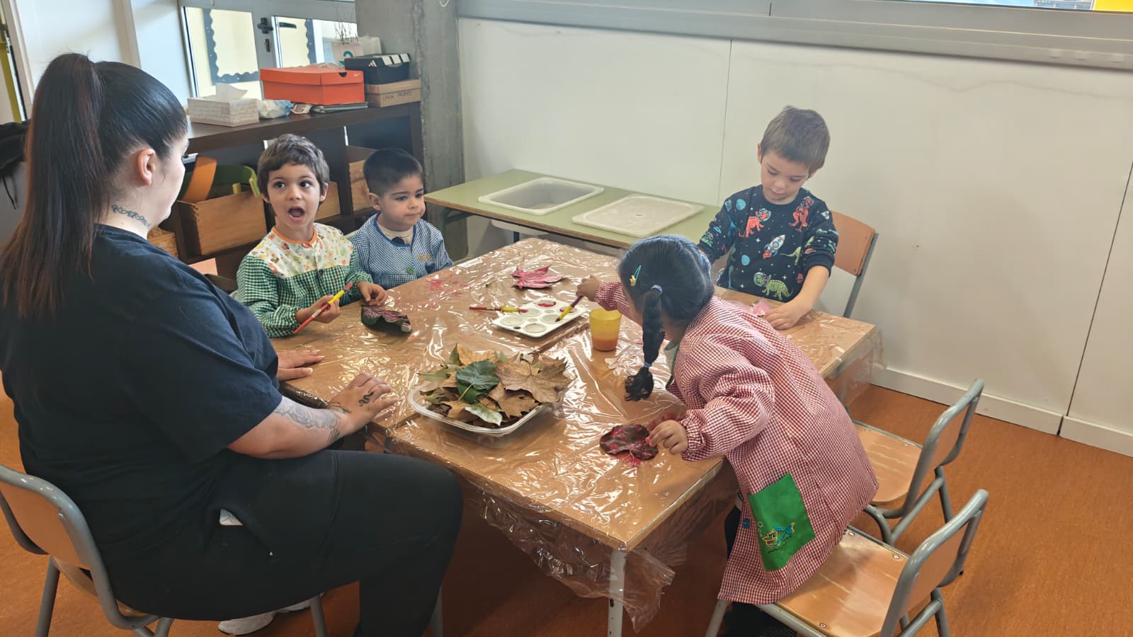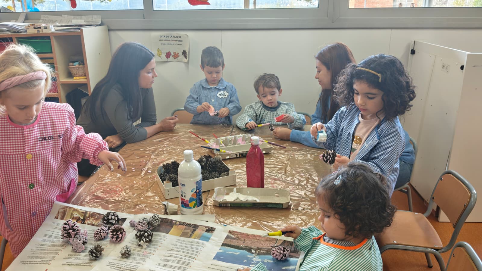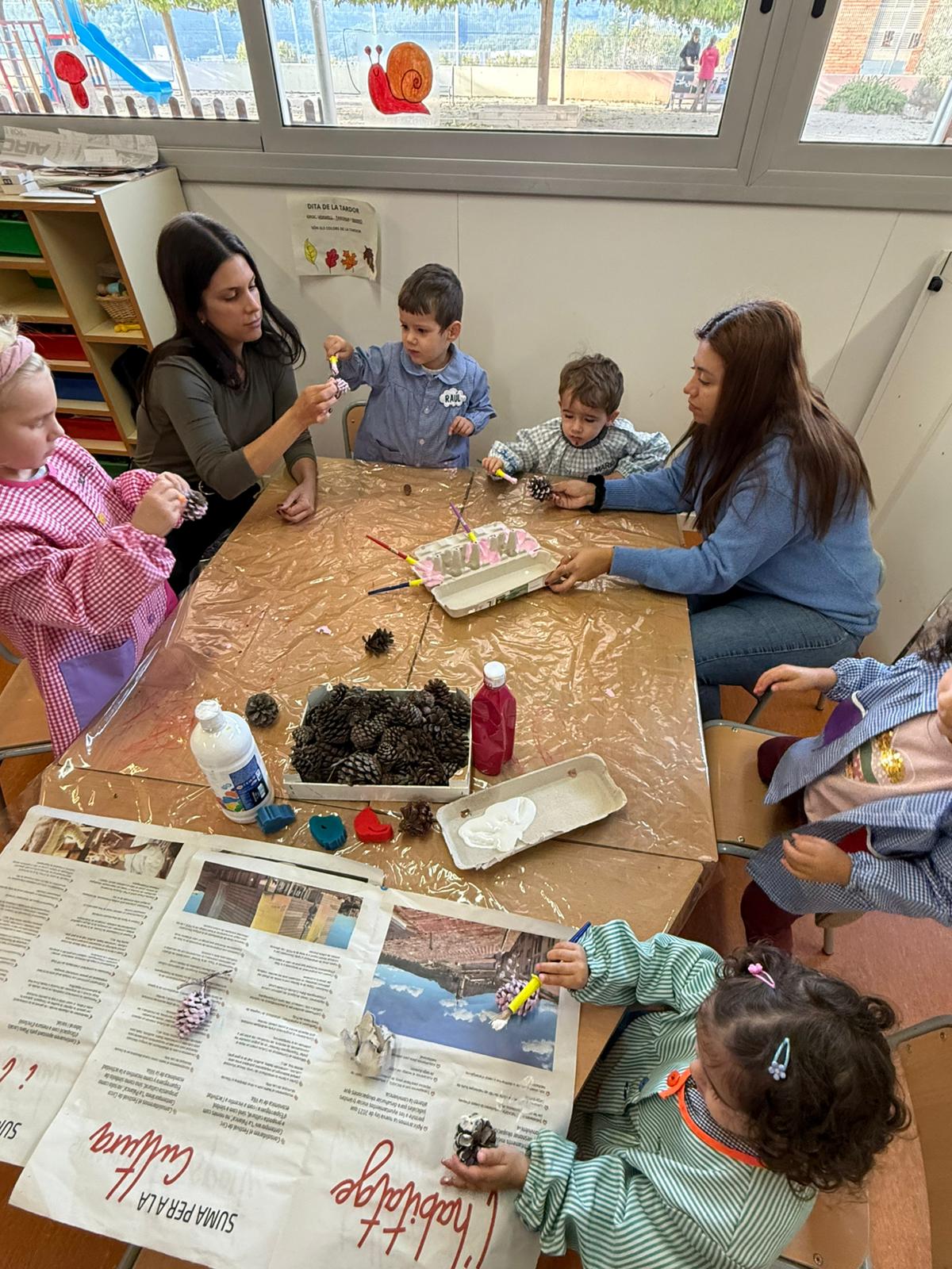 Els tallers van ser pensats i dissenyats per l’equip docent d’Educació Infantil. Es van pintar pinyes, es van guarnir branquetes i pals de fusta amb llanes de colors i també amb pintura, es van pintar lletres i banderoles amb cúrcuma i amb cacao diluïts en aigua; també van estampar formes sobre fulles de diferents tipus.