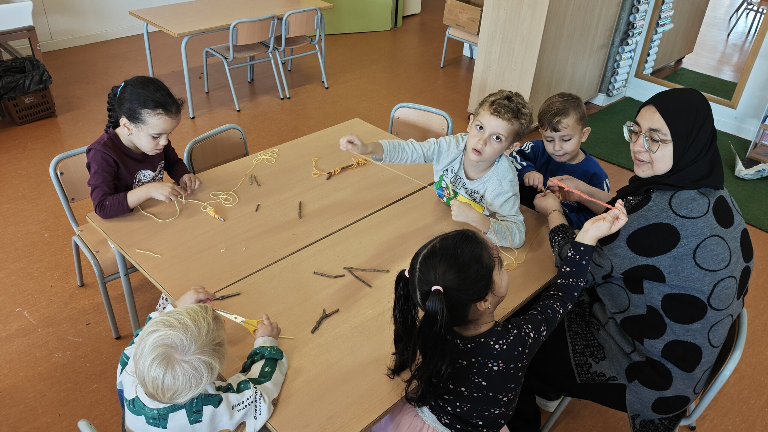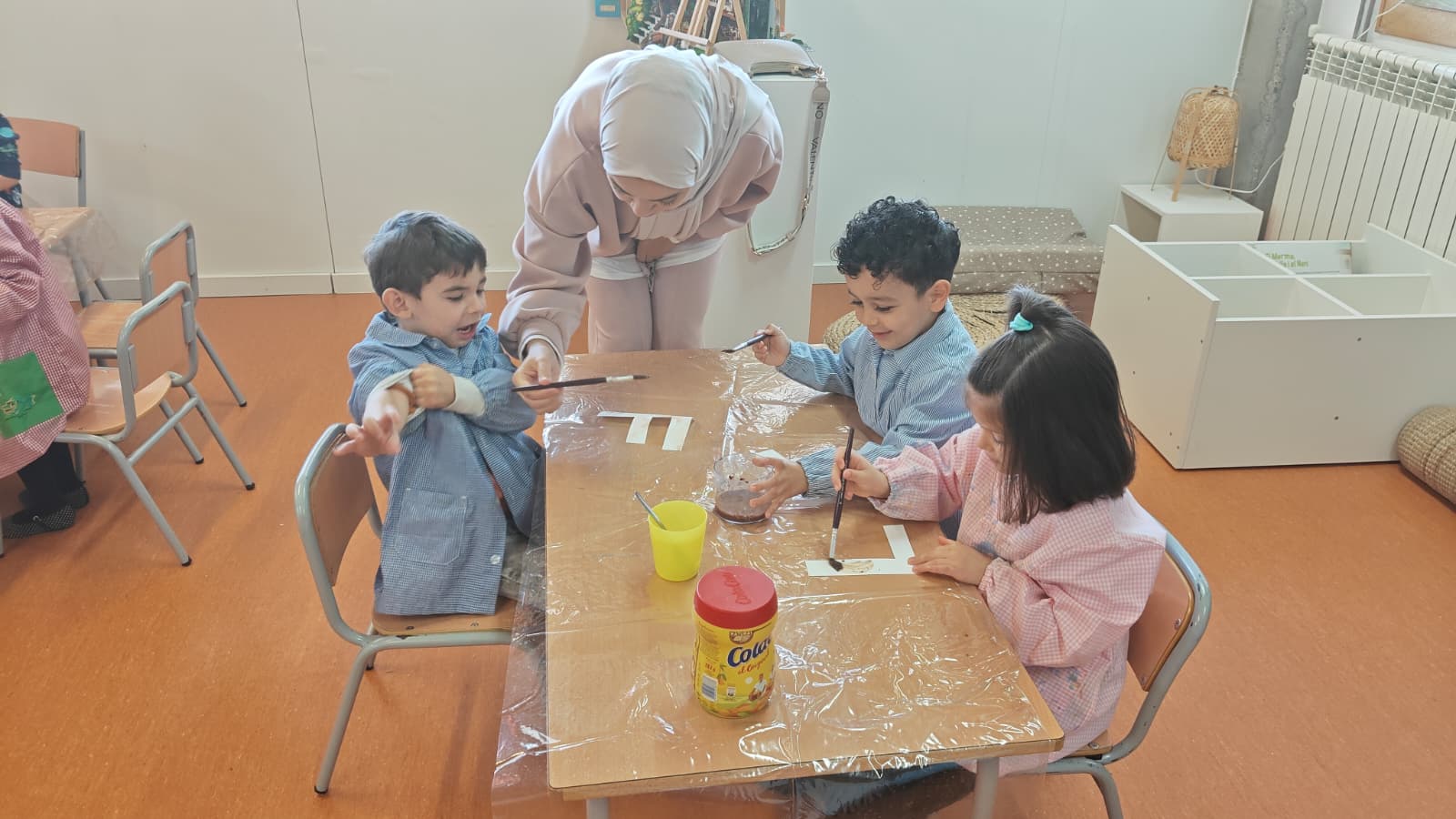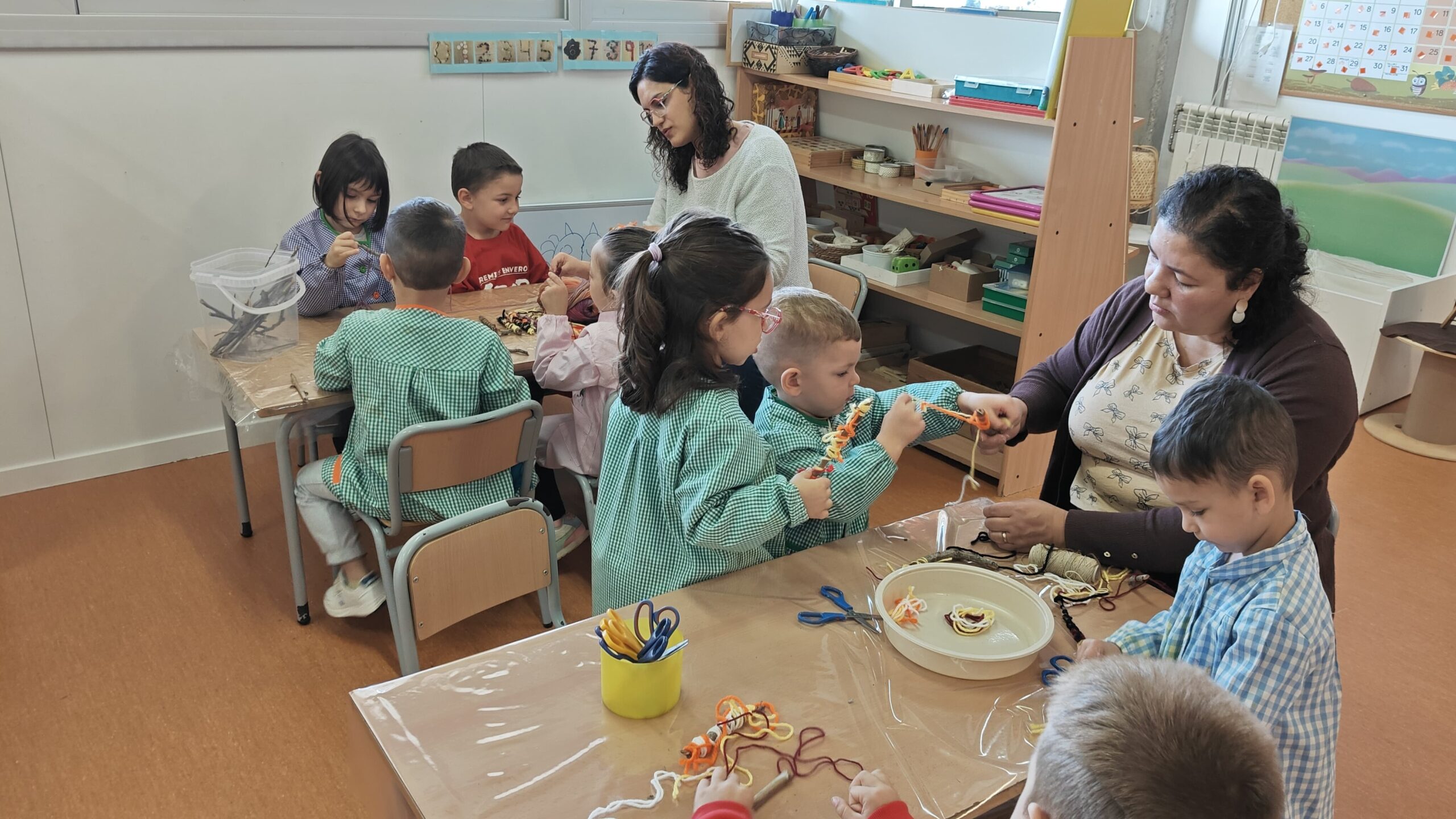 Els tallers van ser pensats i dissenyats per l’equip docent d’Educació Infantil. Es van pintar pinyes, es van guarnir branquetes i pals de fusta amb llanes de colors i també amb pintura, es van pintar lletres i banderoles amb cúrcuma i amb cacao diluïts en aigua; també van estampar formes sobre fulles de diferents tipus.
