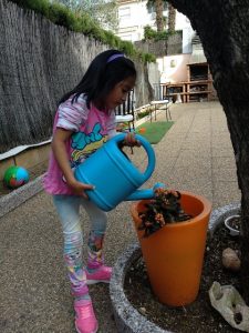 - La Daniela cuida de les plantes del seu jardinet a casa.