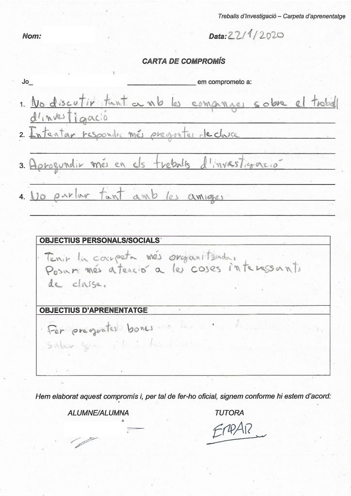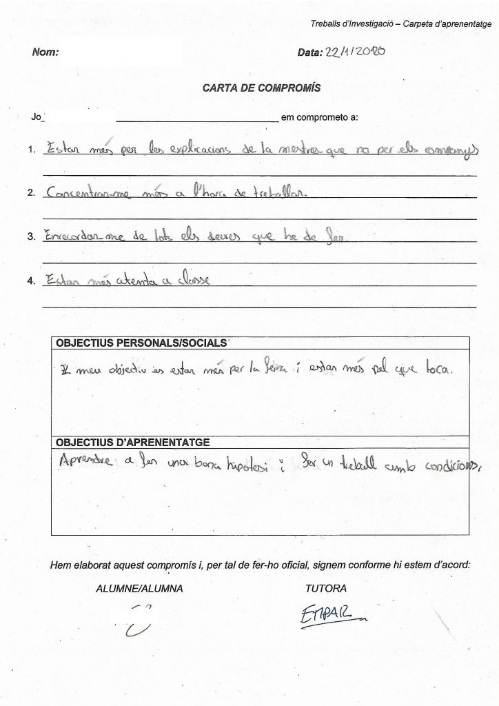 Us deixem algun exemple d’aquests documents d’autoregulació, en concret, les seves cartes de compromís, que han elaborat les nenes i els nens de sisè.