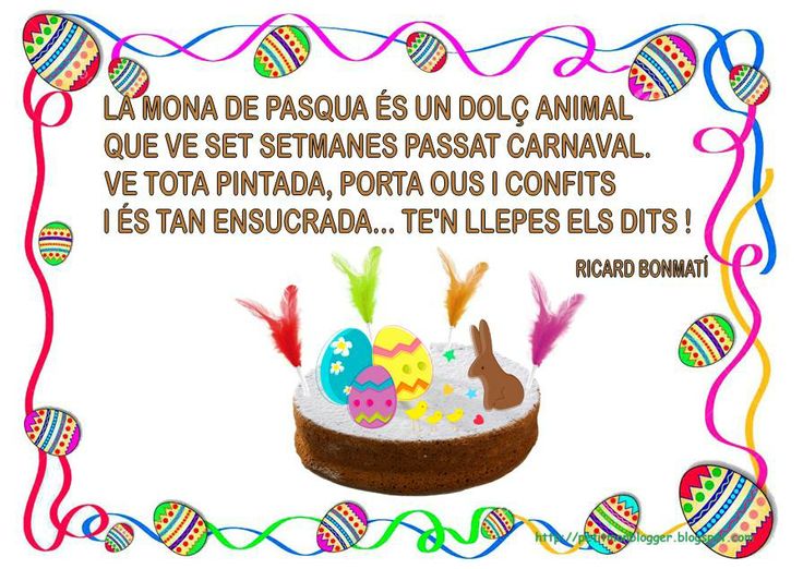 Ja hem arribat al final del 2n trimestre i per celebrar-ho avui us proposo un repte molt especial. Si haguéssim estat a l’escola, avui ens haguéssim menjat una la mona feta per nosaltres, doncs bé, el repte que us proposo avui és que feu una mona o qualsevol altra postra especial i que escriviu la recepta perquè així, tothom que vulgui, pugui gaudir preparant les receptes dels companys.