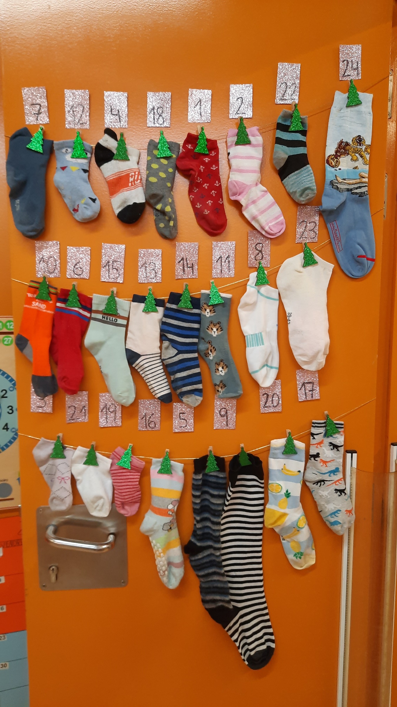 El desembre ja és aquí, i els nens i nenes de 1r hem fet un calendari ben especial. Uns esperem amb emoció el dia de Nadal, d’altres les desitjades vacances… Sigui com sigui, comencem un mes especial, un mes d’alegria, xerinola, família, llums, colors… i desitjos. Cadascú de nosaltres hem escrit un desig de Nadal  i l’hem posat dins del nostre mitjó. 24 mitjons amb 24 desitjos i, com no pot ser d’una altra manera, una sorpresa ben dolça en forma de xocolata.
