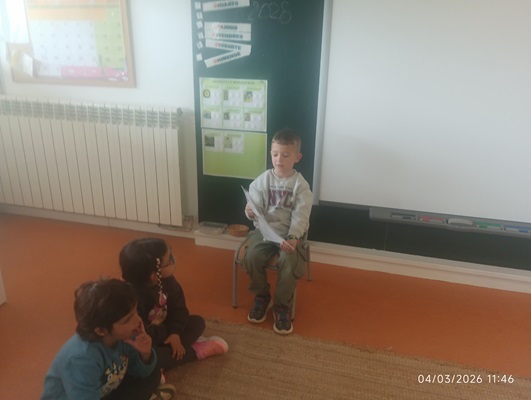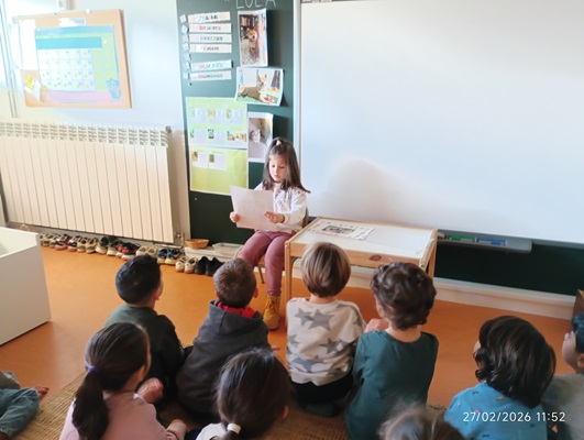 Durant la sessió de l’hora del conte fem una lectura expressiva del conte “TInc un drac a casa” (editorial Cruïlla. L’Àlex , el protagonista del conte, s’ha trobat un drac al soterrani de casa i no sap què fer. Mitjançant la lectura de les diferents cartes que conté el llibre els infants poden anar descobrint com l’Àlex va aprenent a cuidar d’aquell animal.
