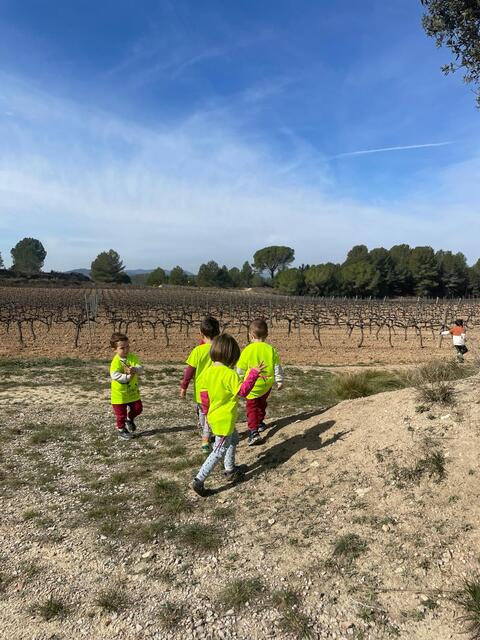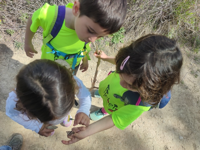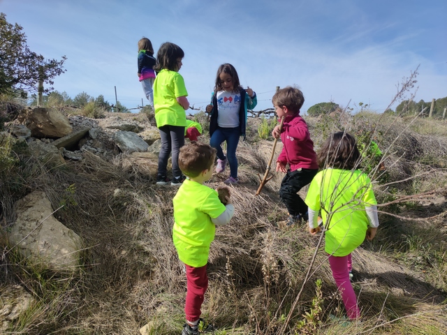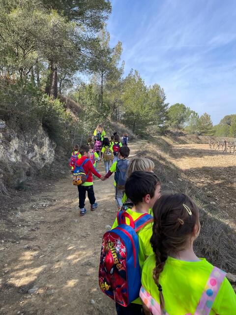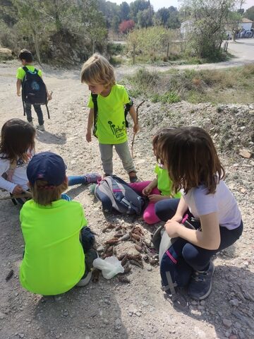 La comunitat de petits vam anar de sortida als pèlags fins arribar al dipòsit d’aigua. Allà vam fer d’exploradors i exploradores per un bosquet, vam investigar petjades de porc senglar i d’altres animals pel camí… i vam recollir elements del bosc (pinyes, closques de cargols, pals…).