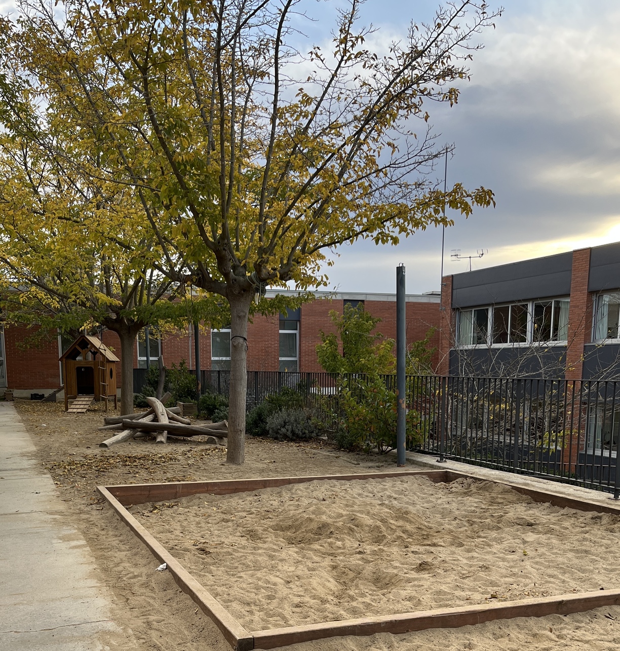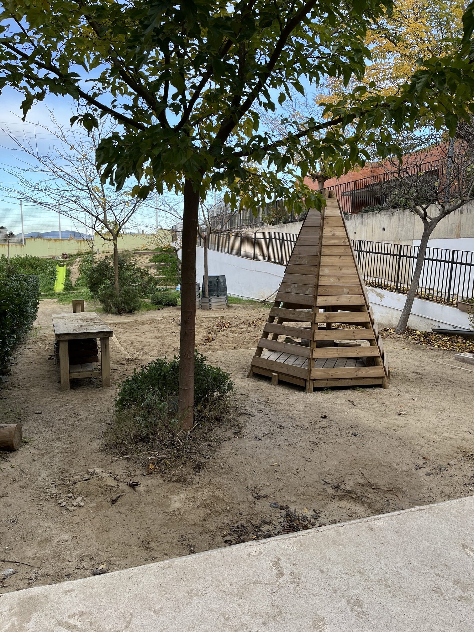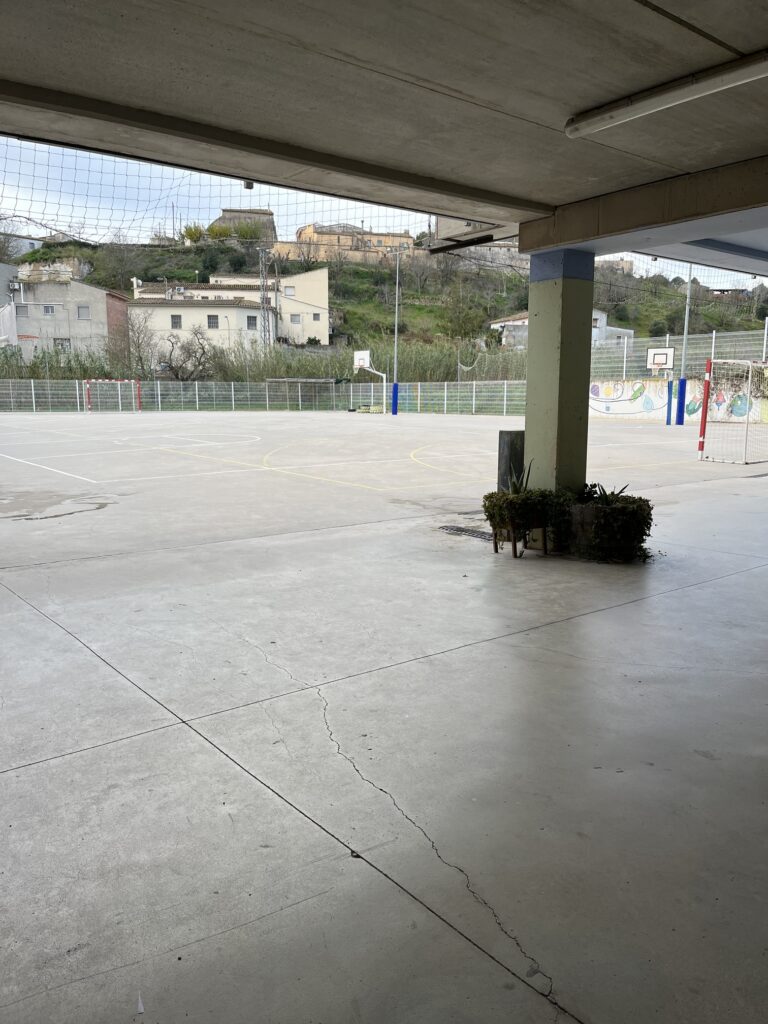 Hi ha tres patis diferents: hi ha el pati dels petits on hi ha coses infantils per la seva edat casetes, tobogans, sorral, etc. També hi ha el pati del mig, que hi ha un sorral, cubells… per últim hi ha el pati de baix que hi ha una pista gran per jugar a futbol, bàsquet, tenis, ping-pong, voley, hoquei… Després hi ha dos quartets per guardar material.