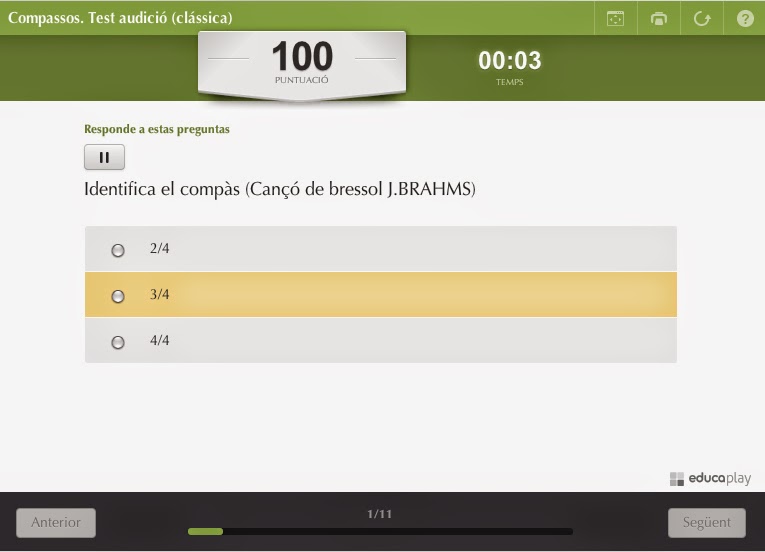 Avui hem estat treballant el compàs amb la classe de 3r. El compàs és la mesura que es pren com a unitat per dividir una obra musical en trossos de la mateixa durada. Està indicat al començament dels compassos, i afecta i queda reflectit en el pentagrama per les línies divisòries perpendiculars que el tallen. Segons la quantita de temps que tenen es poden considerar: