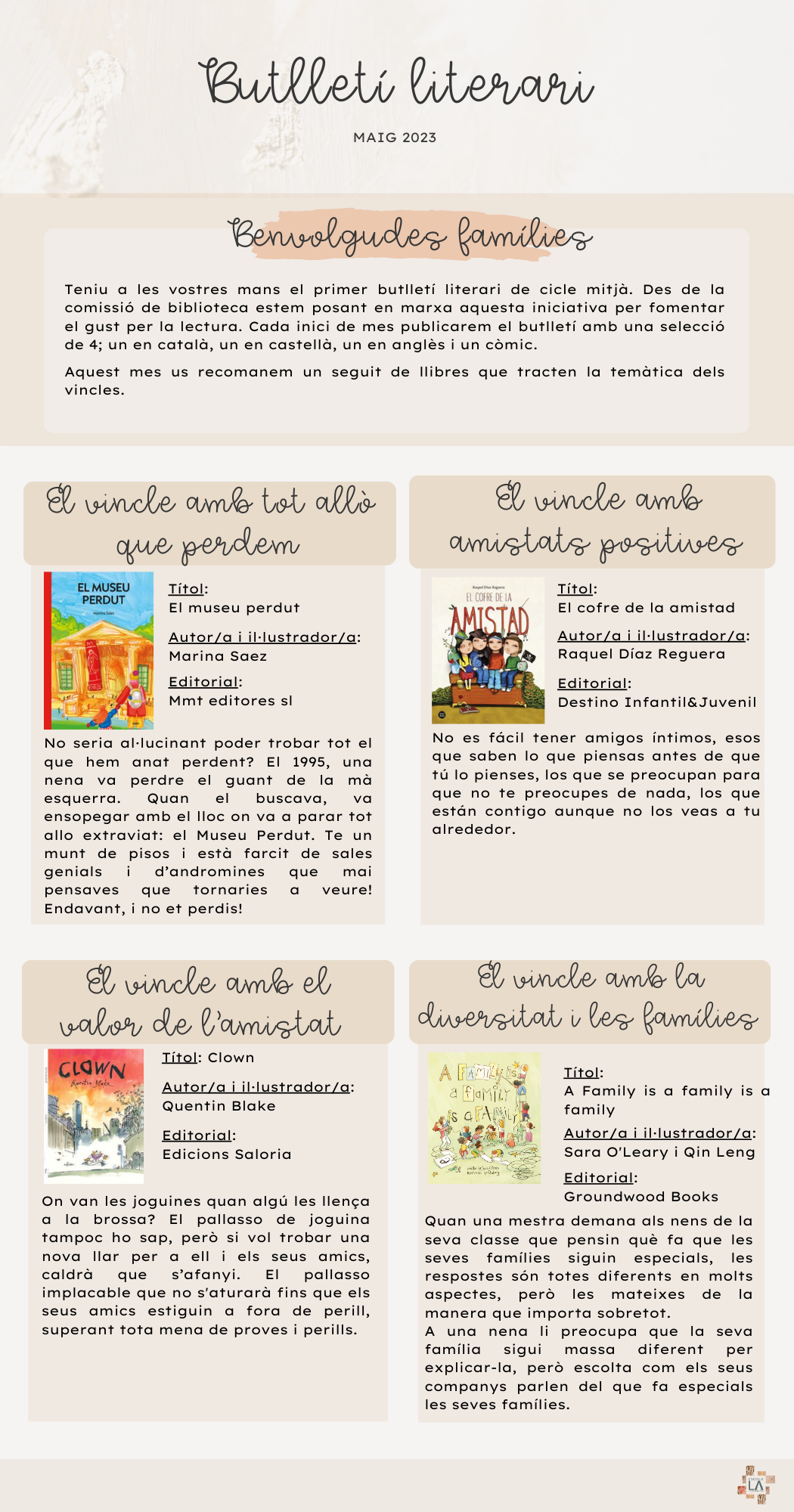 Us presentem el primer butlletí literari de l’escola Lola Anglada. Des de la comissió de biblioteca estem posant en marxa aquesta iniciativa per fomentar el gust per la lectura. Cada inici de mes publicarem el butlletí amb una selecció de 4 recomanacions literàries per a cada cicle.