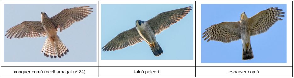 I què ha passat en aquesta darrera entrega? Doncs que hi ha hagut moltes errades d’identificació en l’ocell amagat nº 24! Molts de vosaltres l’heu identificat com esparver o com falcó pelegrí. Us poso una imatge on es poden veure aquests tres rapinyaires i així en podeu veure les diferències.