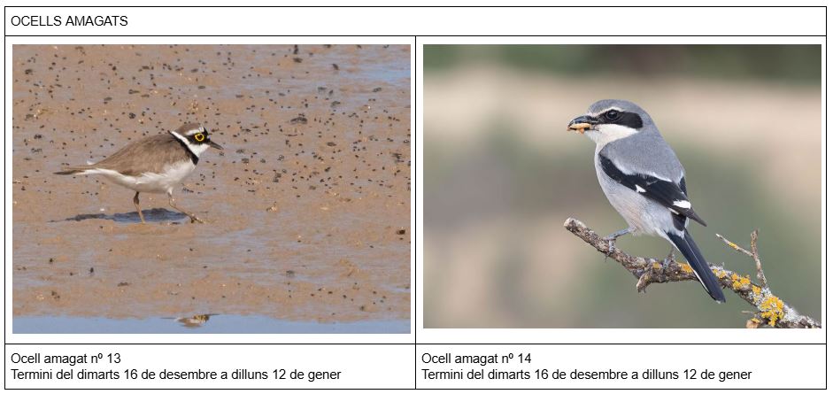 Cada ocell encertat atorga un punt. Podeu enviar totes les respostes en un mateix correu indicant clarament si són els ocells amagats, els ocells de repàs del pati i ocells d’aiguamolls.