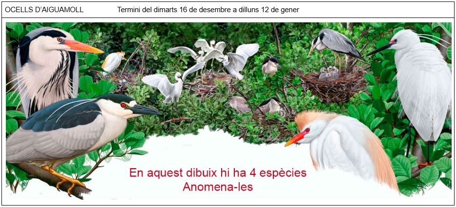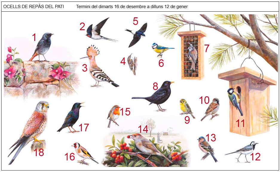 ATENCIÓ JUGADORS s’acaba el primer trimestre de curs i arriben les vacances de Nadal… i amb les vacances, 2 ocells amagats i 22 ocells que us poden donar en total 24 punts al vostre caseller. Anem a pams: els primers punts de bonificació (18 punts) és un repàs d’ocells que veiem al nostre pati amb certa facilitat i el segon repte són 4 espècies que podreu veure amb certa facilitat a les colònies del Delta de l’Ebre que fareu a la primavera. Dels dos ocells amagats d’aquesta 7ª entrega us en parlaré una mica més endavant.