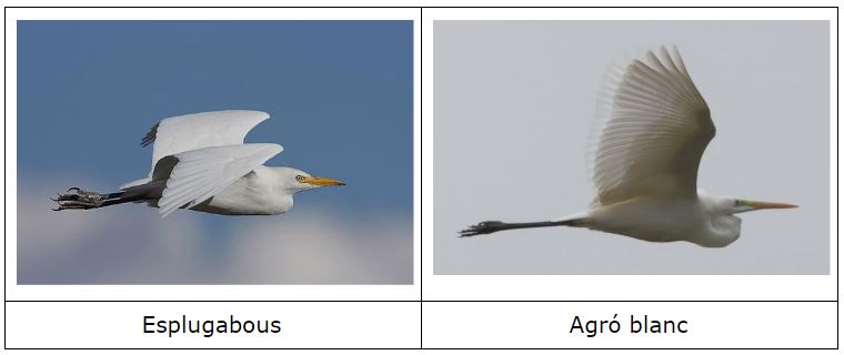 Aquesta setmana l’ocell nº 17 ha portat confusió i per tant errades (cal llegir les cartes que hi ha pistes que ajuden!). L’ocell del joc és l’esplugabous i alguns de vosaltres l’heu confós amb l’agró blanc. A la fotografia no es pot apreciar bé el tamany però l’esplugabous és menut (uns 50 cm) i l’agró blanc és molt gran (uns 90 cm). Ja sé que em direu que a la fotografia això costa de veure. Hi ha una altra aspecte que els diferencia, el comportament: els esplugabous van en grups i l’agró blanc és molt més solitari. Us adjunto dues fotografies perquè els pogueu comparar: malgrat els dos repleguen el coll quan volen (com tots els ardeids) l’esplugabous té el coll molt curt i per tant només el replega una miqueta i l’agró blanc fa tota aquella “S” replegada a sota del cap. Les potes de l’agró blanc sobresurten per darrera el cos (en vol) molt més que l’esplugabous. La silueta de l’esplugabous és molt més compacta i grassoneta que la de l’agró blanc, molt més estilitzada i afuada i on el seu bec és molt més llarg i més en forma de llança. Aquestes dues fotografies us ajudaran a apreciar aquests detalls i facilitar la vostra identificació quan estigueu a la natura.
