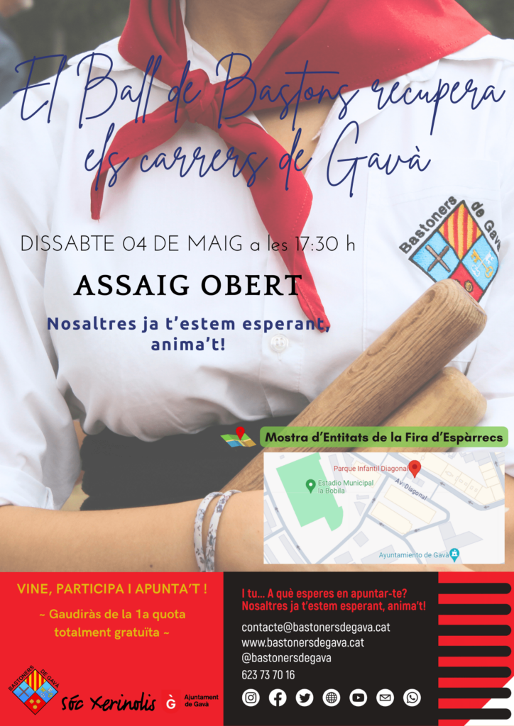 Bon dia! El Ball de Bastons recupera els carrers de Gavà amb un seguit d`assaigs oberts a tota la ciutadania, el proper tindrà lloc el dissabte 04 de Maig de 17:30 a 18:30 hores a la seva paradeta de la Mostra d’Entitats de la Fira d’Espàrrecs, a l’alçada del Parc infantil diagonal. Des de la