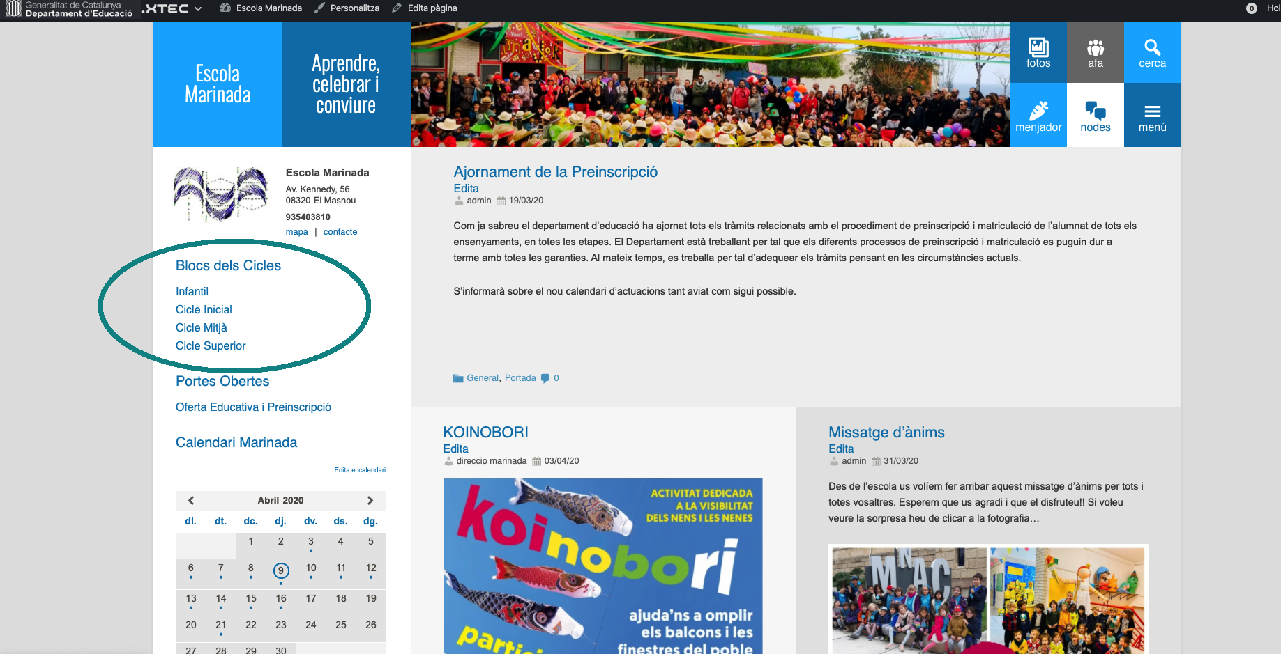 Algunes famílies ens havien demanat que no trobaven fàcilment l’accés als diferents blocs dels cicles des de la pàgina web. Tot i que us recordem que es pot arribar fàcilment a través del botó de “Menú” que està situat a la part de dalt a la dreta de la pàgina, també hem ubicat un altre enllaç en el menú de l’esquerra de la pàgina principal. Us adjuntem una captura de pantalla perquè ho tingueu més clar. Una abraçada per tothom.