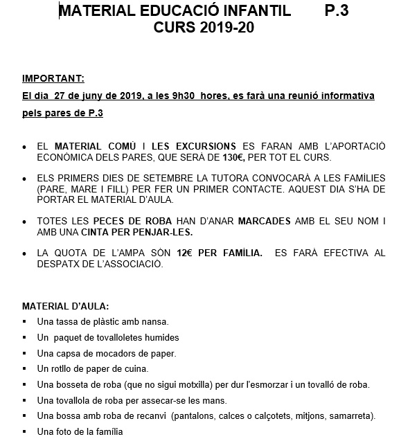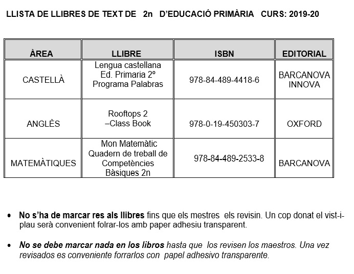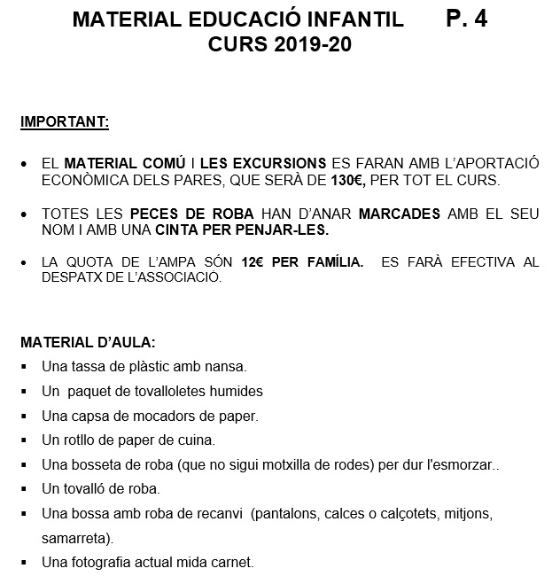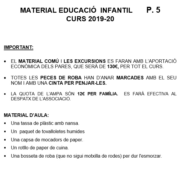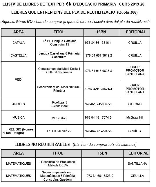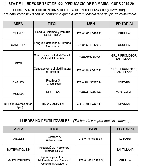 Llibres i material del curs 2019-2020 Feu un comentari / Per Coordinador d'informàtica / 3 de juliol de 2019 / General Portada Un cop finalitzat aquest curs escolar, us deixem tots els llibres i material del curs 2019 – 2020 de cada grup – classe. Bones vacances. P.3 P.4 P.5 PRIMER SEGON TERCER QUART CINQUÈ SISÈ