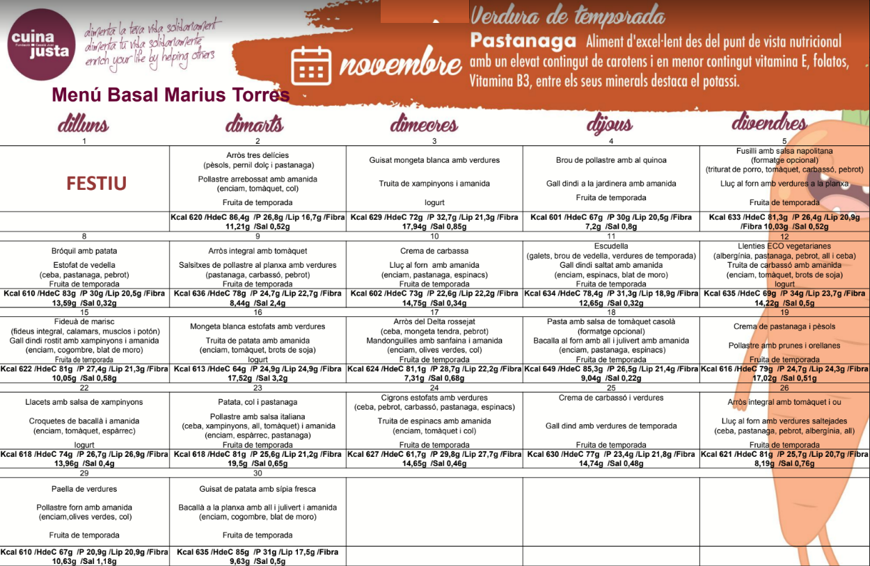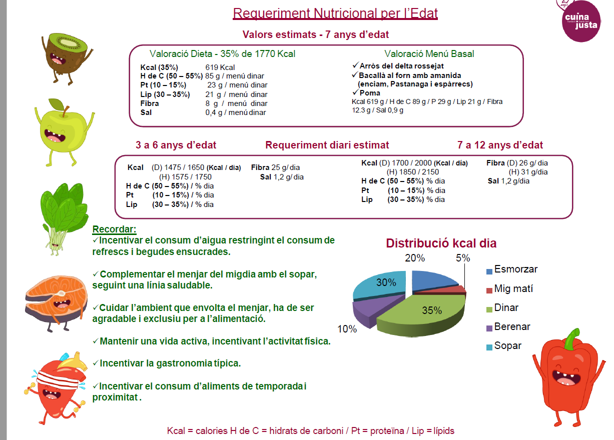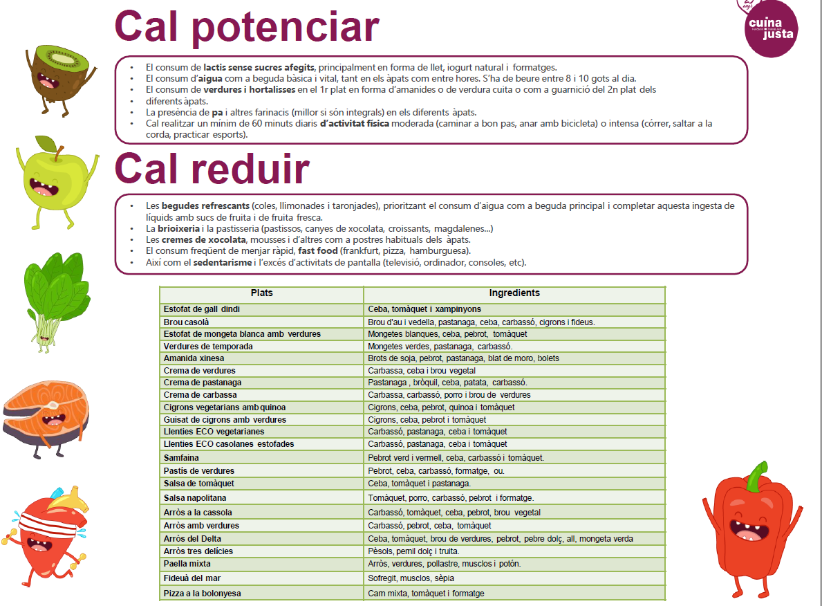 Us recordem que el menjador de la nostra escola es gestionat per la Fundació Cuina Justa, especialitzada en menjadors escolars i amb una ampla experiència en el mon de l’alimentació. Els menjars es basen en la dieta mediterrània amb productes del seu propi hort i amb menus adaptats a les necessitats i caracterìstiques del nostre alumnat.