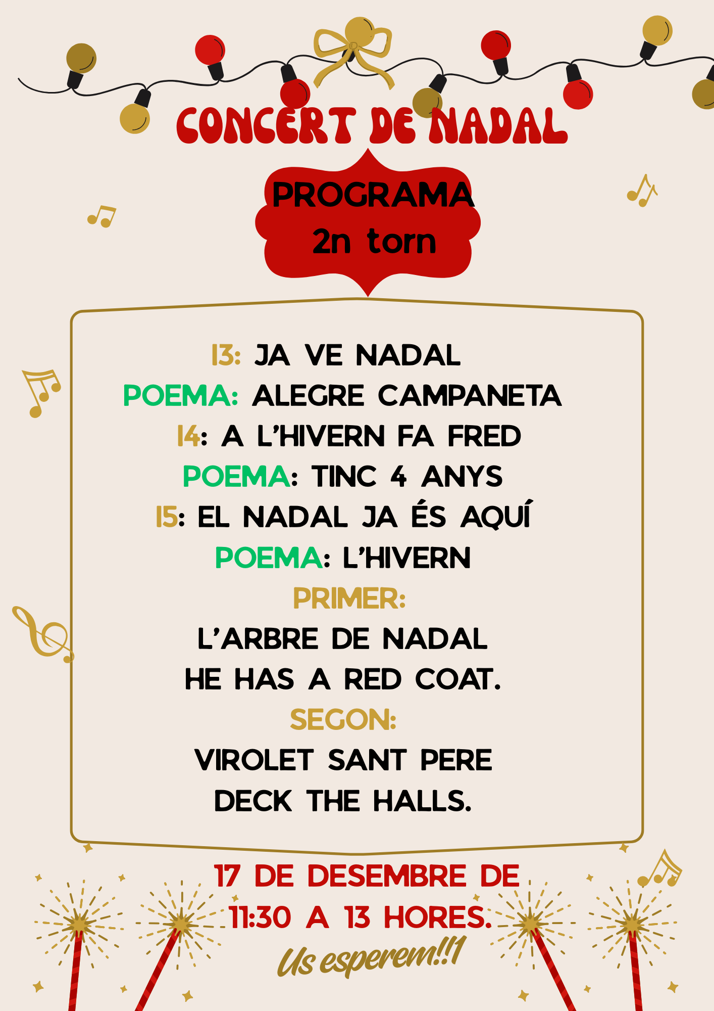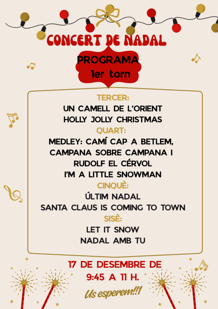 REPERTORI I HORARI DEL CONCERT DE NADAL QUE ES CELEBRARÀ A L’ESCOLA.