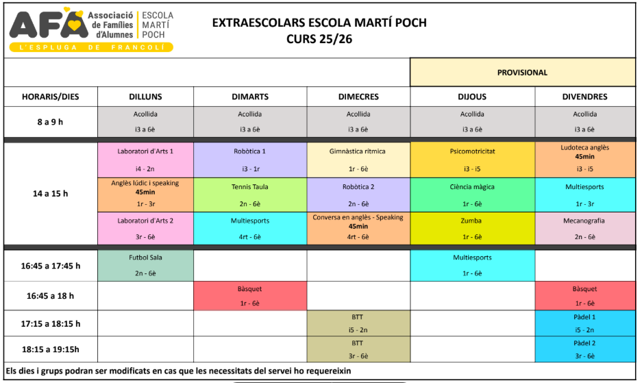 L’AFA organitza les activitats extraescolars que es proposen a l’inici de cada curs i que es duen a terme d’octubre a juny