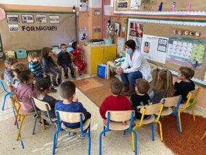 Els més petits de l’escola, els alumnes de P3 i P4 es van familiaritzar amb les tasques d’infermeria amb la Cristina Farré, es van escoltar el cor, van observar i tocar materials de cures i van reforçar el coneixement del seu cos i els hàbits d’higiene.