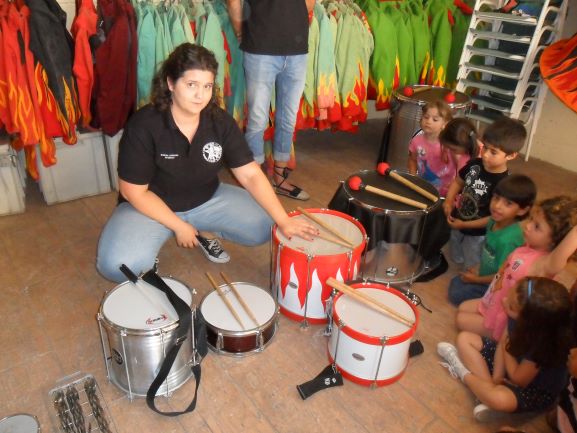 Vestits dels diables dels més petits als més grans, vestits de la diablessa i del diable Major tots arrenglerats i penjats. Les forques dels diables més importants, les maces totes classificades. Tots els diferents tipus de tambor i bombos ben col·locats als seus prestatges. La Iris ens va fer una demostració de com sonaven i després ens els va deixar provar. Quina saragetada… Les bèsties reposant i mirant-nos.