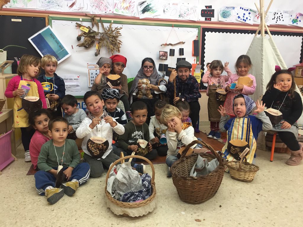 En acabar de torrar les castanyes, a l’escola també van arribar 3 esplèndides castanyeres! Eren l’Antonio, la Carmen i la Sisqueta, que amb el seu bon humor van fer riure a tots els petits! També els hi van explicar d’on venien, quants anys tenien… i finalment els hi van repartir castanyes i els van posar a la seva bosseta!