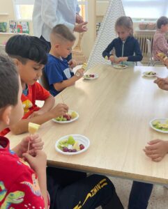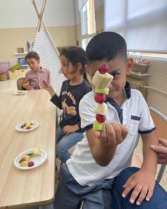 Al taller d’alimentació saludable hem conegut l’hort d’en Marçal, hem ballat un rap molt divertit i després hem fet brotxetes de fruita!
