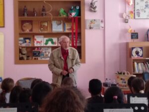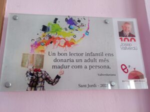 Tot seguit a la biblioteca Josep Vallverdú ja l’esperaven els alumnes de primer, segon i tercer. Li han explicat diverses activitats que hem realitzat a l’escola durant aquest curs, en què el projecte interdisciplinari gira entorn la seva figura i obra. També li han recitat poemes dels llibres Bestiolari i li han comentat el llibre de La conquesta del barri. Cada grup ha recollit un conjunt de paraules que han anat dipositant dins del “Senalló de paraules”.