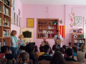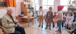 Tot seguit ha arribat el torn dels alumnes de quart, cinquè i sisè. Se li ha presentat una auca, que arriba fins a l’actualitat i també se li ha fet entrega d’un munt de paraules que han après al llarg d’aquest curs sobre el parlar espluguí (Splug mots) i sobre el projecte “Carro, tupines i cançons”. Tampoc hi ha faltat una petita mostra de l’obra de teatre que l’alumnat de cinquè representa aquesta setmana a la XVIII Mostra de teatre a l’escola. Obra adaptada que gira entorn de la biblioteca del centre i l’obra de teatre “El núvol” de Josep Vallverdú.