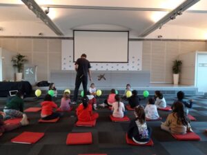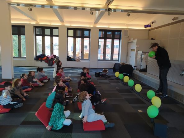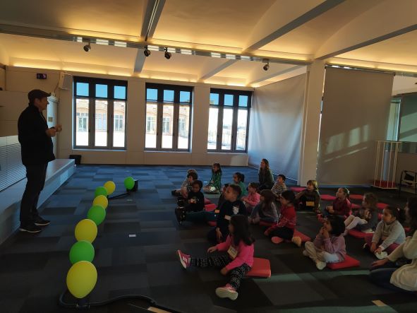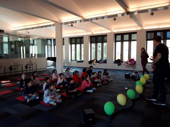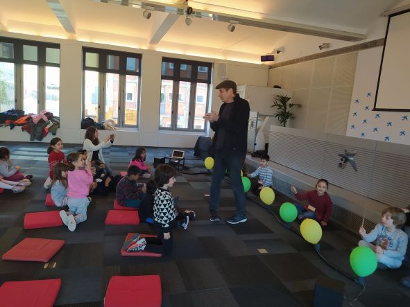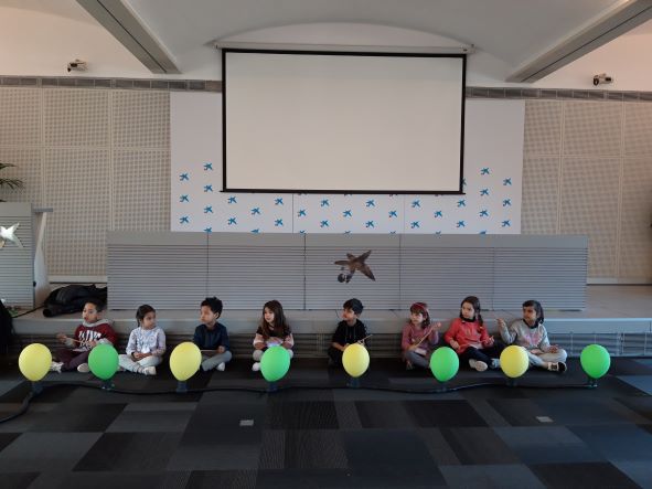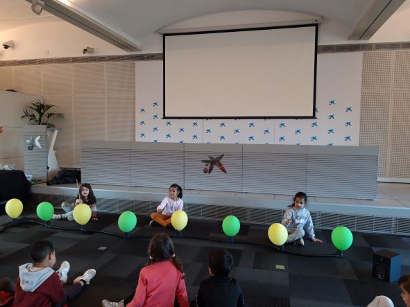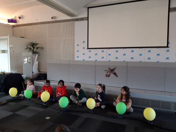 Aquest divendres al matí els nens i nenes d’EI-5 anys han participat de l’activitat “globus 2.0” a Caixaforum. El so ens pot explicar històries. Sentim el so d’un cotxe que passa, una ambulància allà lluny i una moto. què és el que imaginem? Una persona pot pensar que és Barcelona durant el dia i una altra imaginar-se que és París quan es fa fosc. Els mateixos sons poden explicar històries molt diferents a cada persona. Hem fet volar la nostra imaginació, ens ho hem passat d’allò més bé !
