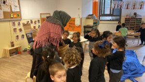DIVENDRES, ENS VA VISITAR LA CASTANYERA. VA ARRIBAR DE LA MUNTANYA, DE COLLIR CASTANYES AL BOSC PER A TOTS ELS NENS I LES NENES DE L’ESCOLA. S’HA PRESENTAT AMB EL VESTIT TRADICIONAL (FALDILLA ACAMPANADA, CAMISA, DAVANTAL, MOCADOR I CISTELL ON CONSERVAR LES CASTANYES CUITES I CALENTES).
