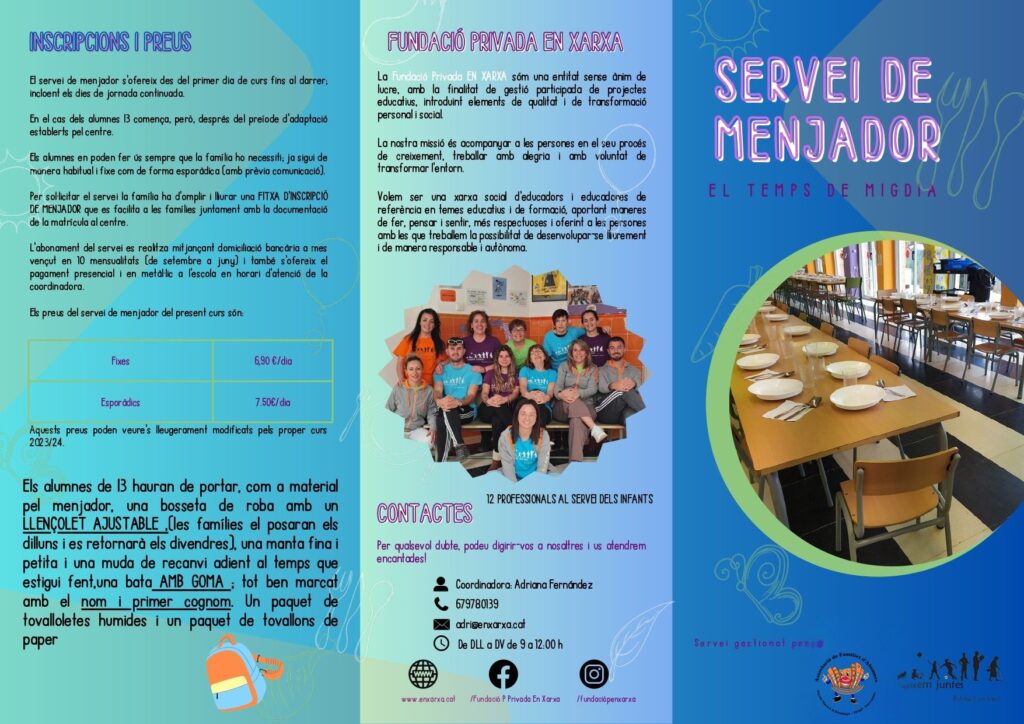 Per qualsevol dubte o qüestió poseu-vos en contacte amb la coordinadora del menjador. Disposeu d’horari d’atenció a l’escola de dilluns a divendres de 9:00 a 12:00 hores. També podeu escriure a l’adreça electrònica adri@enxarxa.cat, trucar al telèfon 679780139 i enviar whatsapp.