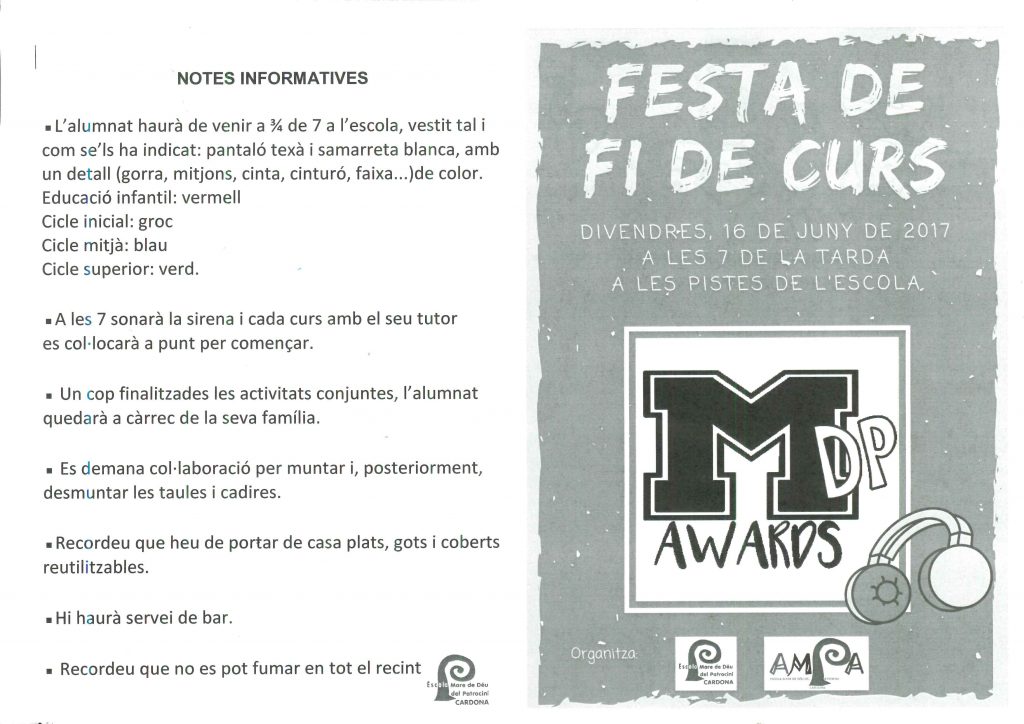 Aquí podeu consultar la programació de la festa de fi de curs i informació que cal tenir en compte: