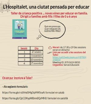 S’inicia de manera telemàtica el Taller de criança positiva als barris de la Florida- Les Planes. Aquest Taller dirigit a famílies té com a finalitat tractar els dubtes i inquietuds en la criança dels fills i filles de 0 a 6 anys. El taller es realitzarà els dimarts: 27 d’octubre, 3 de novembre, 10 de