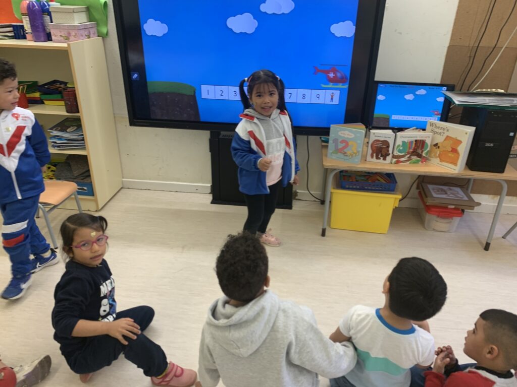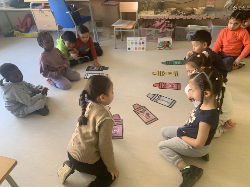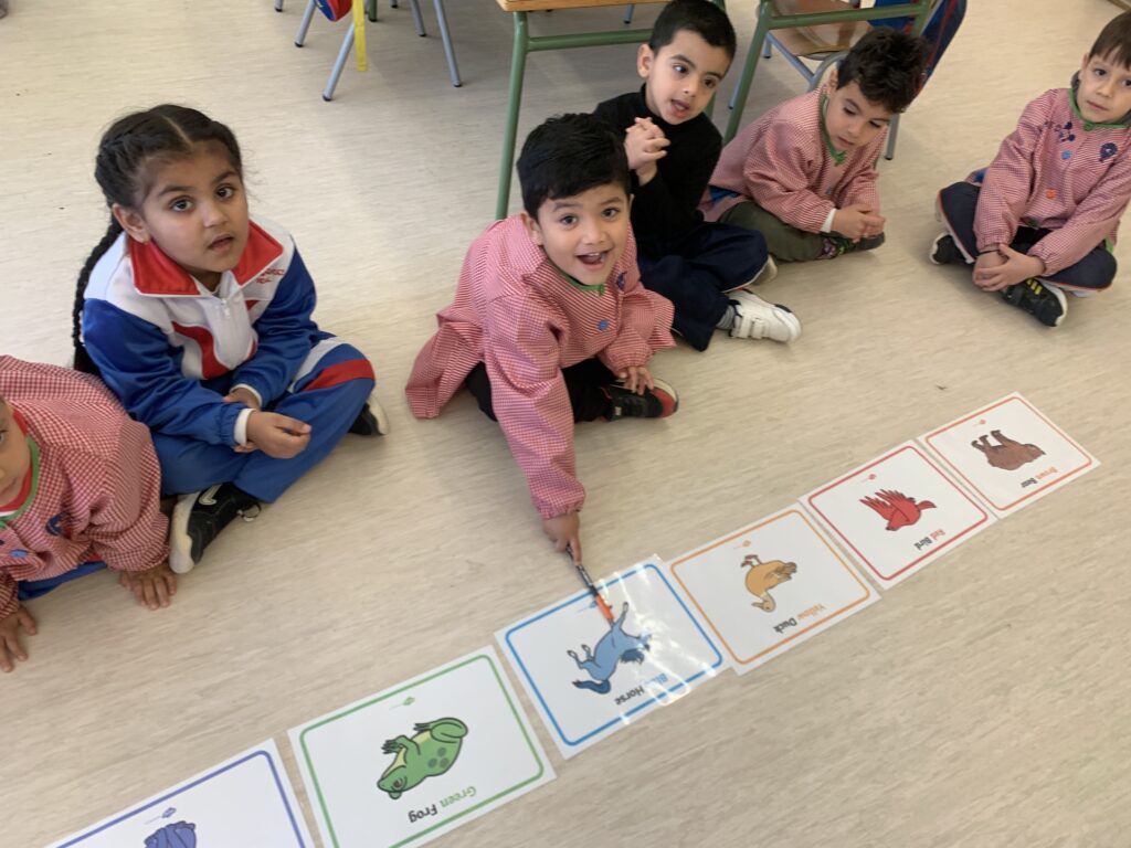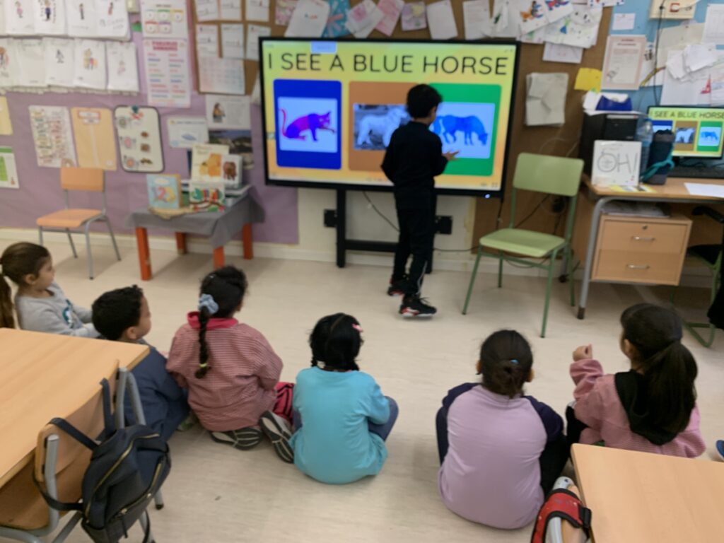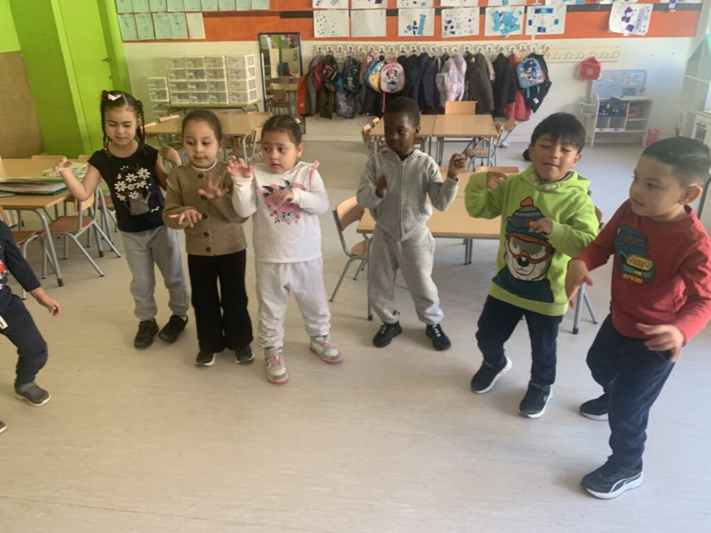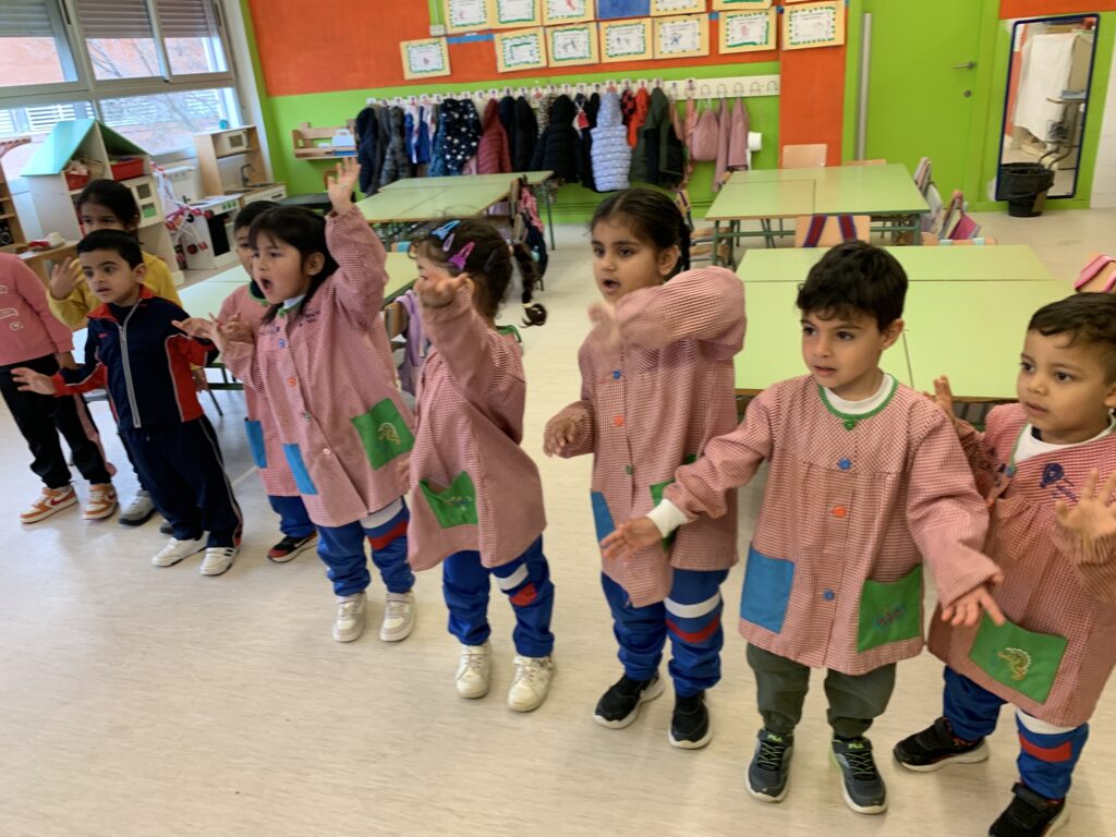 In I3, we begin using English listening to songs, doing actions, and dancing. The goal is to introduce the students to vocabulary such as colours, numbers from 1 to 5, and some animals.