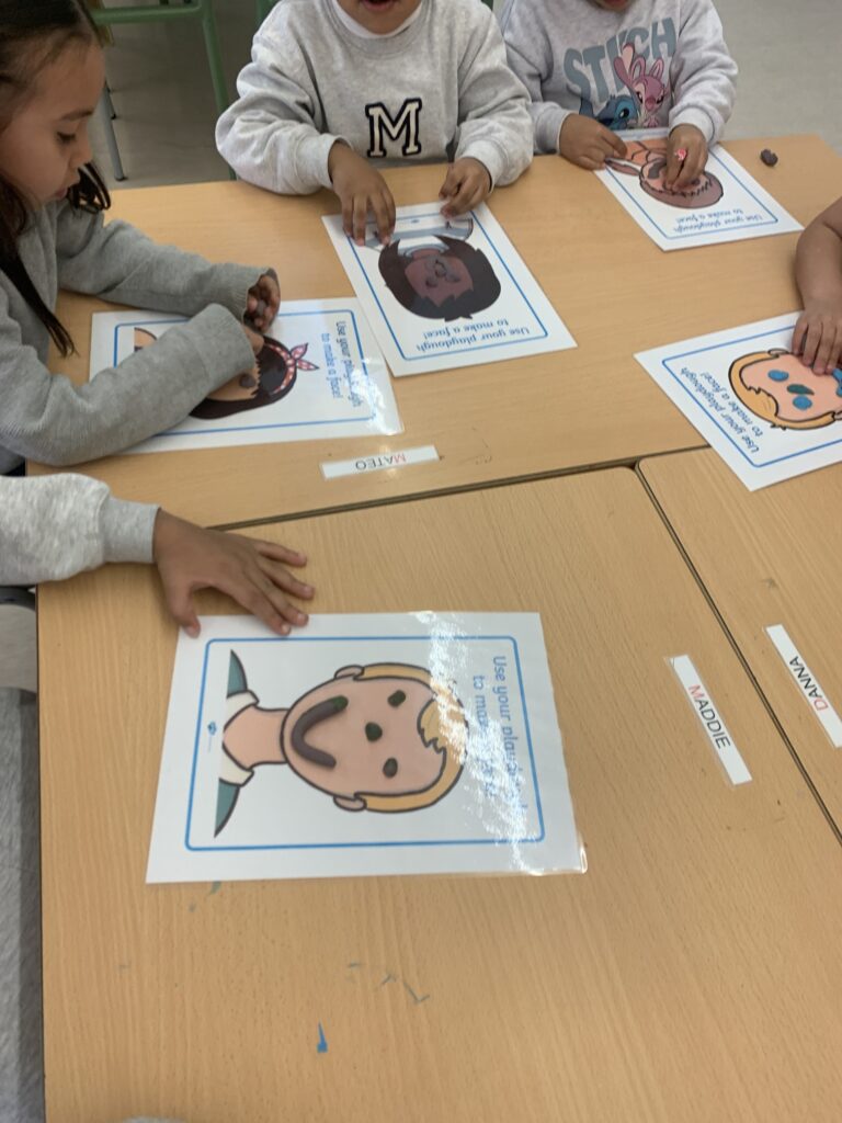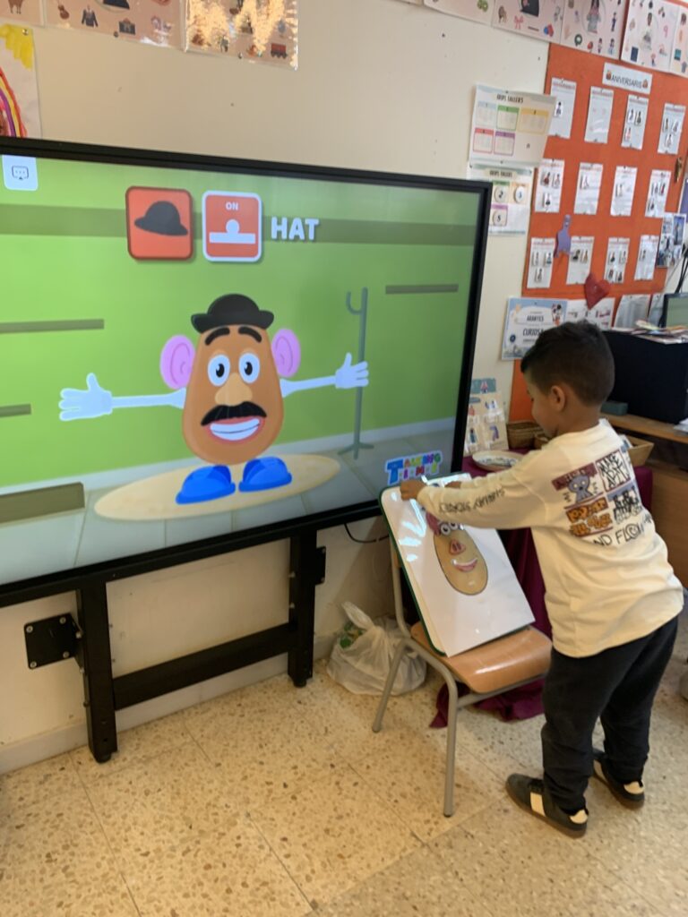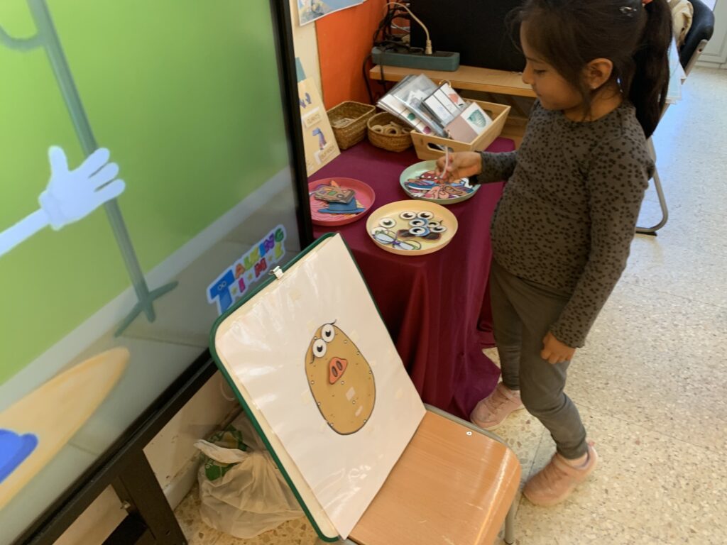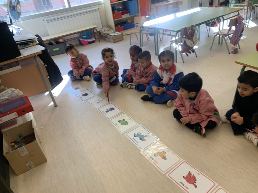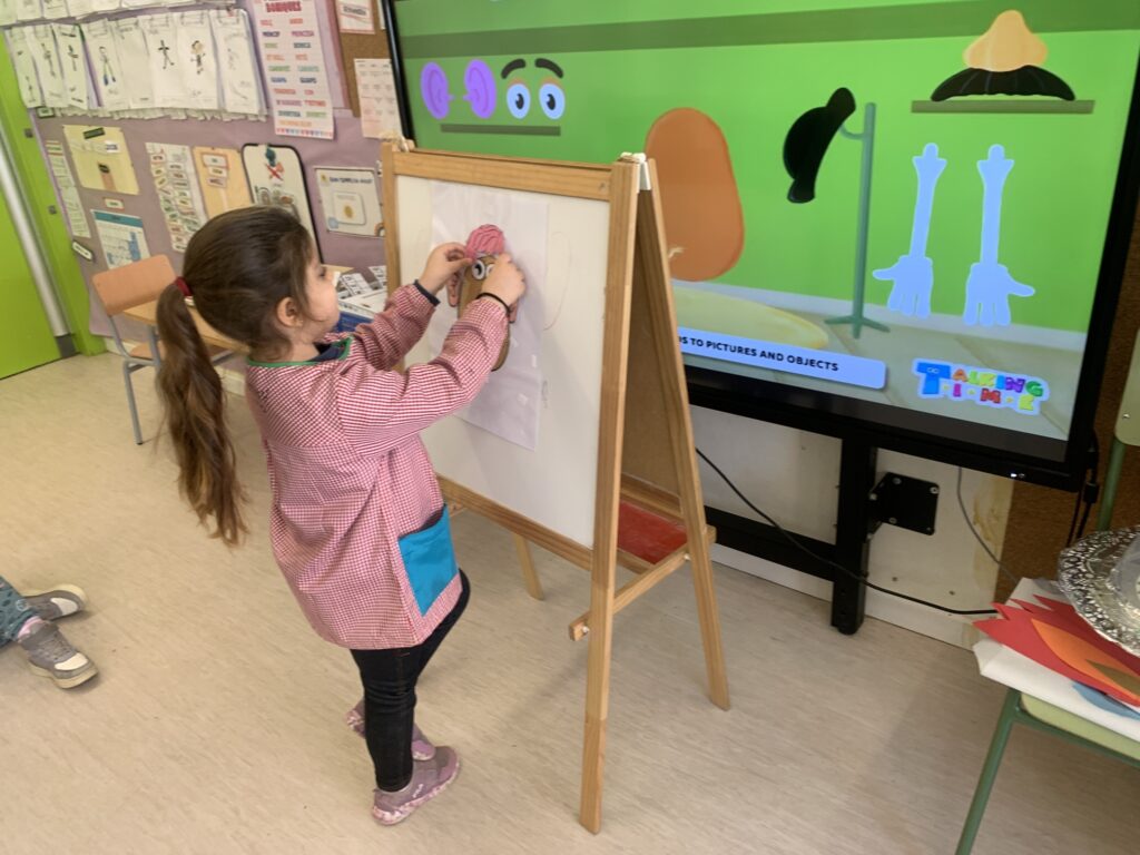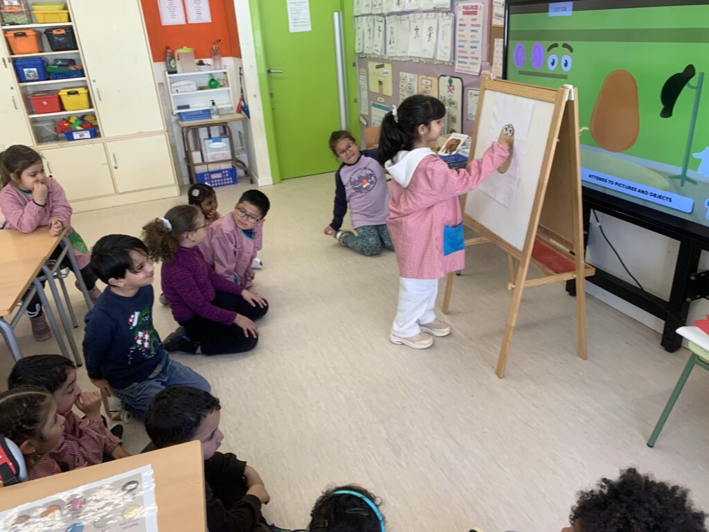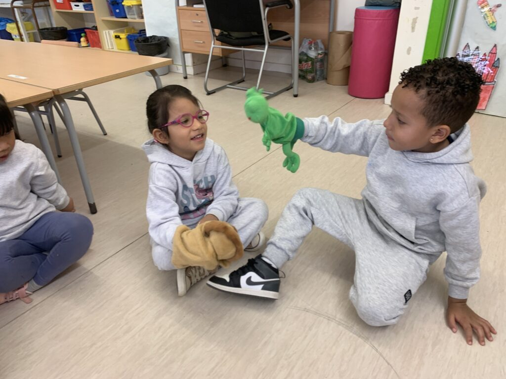 A I4 i I5 continuem amb les mateixes dinàmiques d’aprenentatges ampliant vocabulari a través de contes. L’alumnat interactua amb titelles i comencen a interioritzar més els conceptes. Algunes temàtiques són les distincions entre animals de la granja i salvatges, el menjar saludable i no saludable, el reciclatge que fem sobretot a l’escola i anomenar les parts de la cara i algunes parts del cos del Mr. Mrs. Potato.
