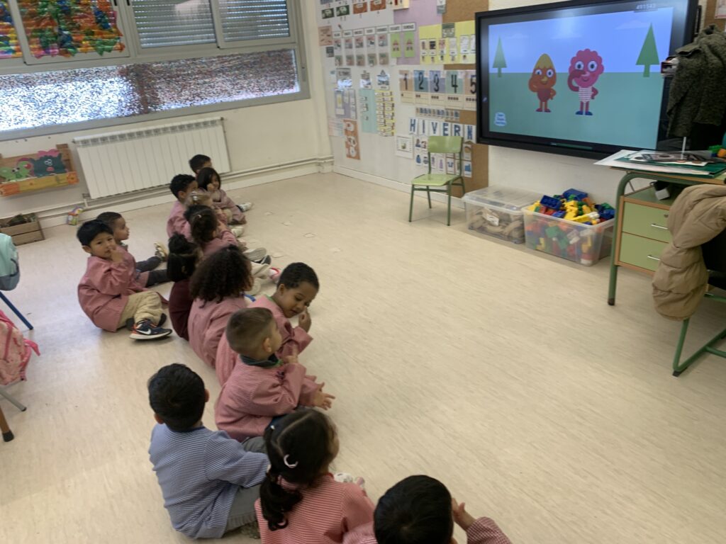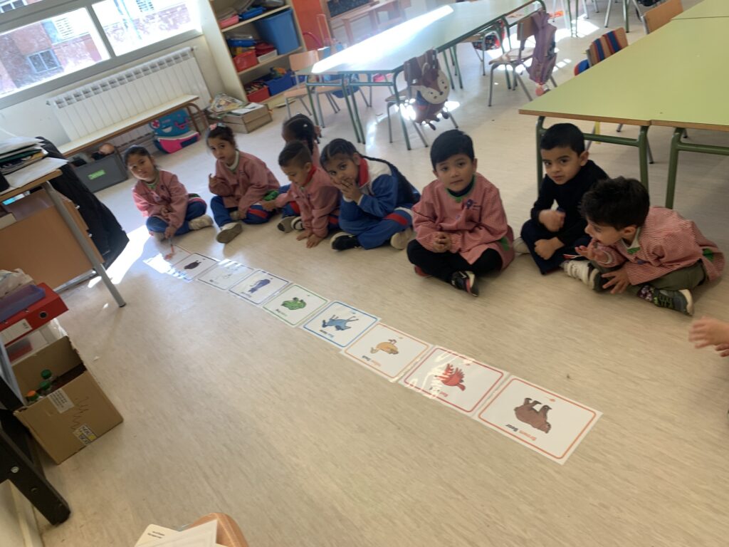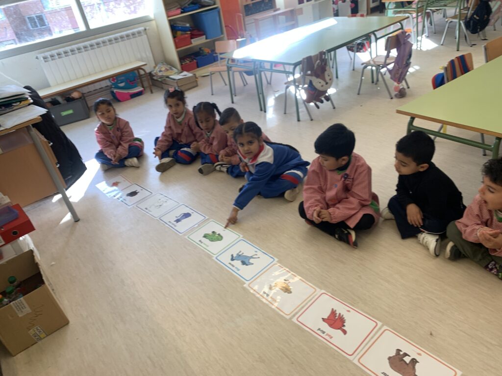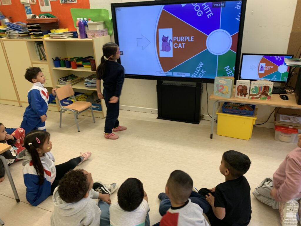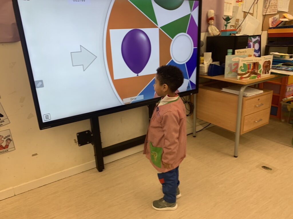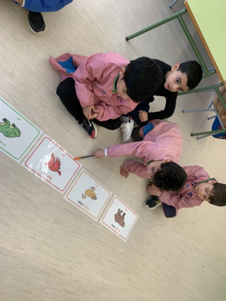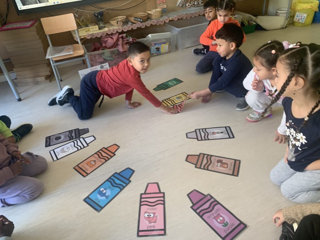 A I3 comencem a utilitzar la llengua anglesa escoltant cançons amb les quals fem mímica i ballem. La intenció és endinsar l’alumnat en l’ús de vocabulari com els colors, els números de l’1 al 5 i alguns animals.