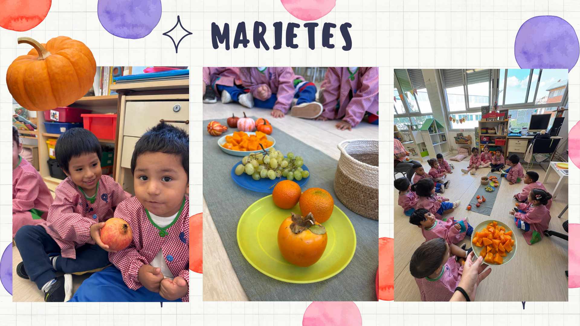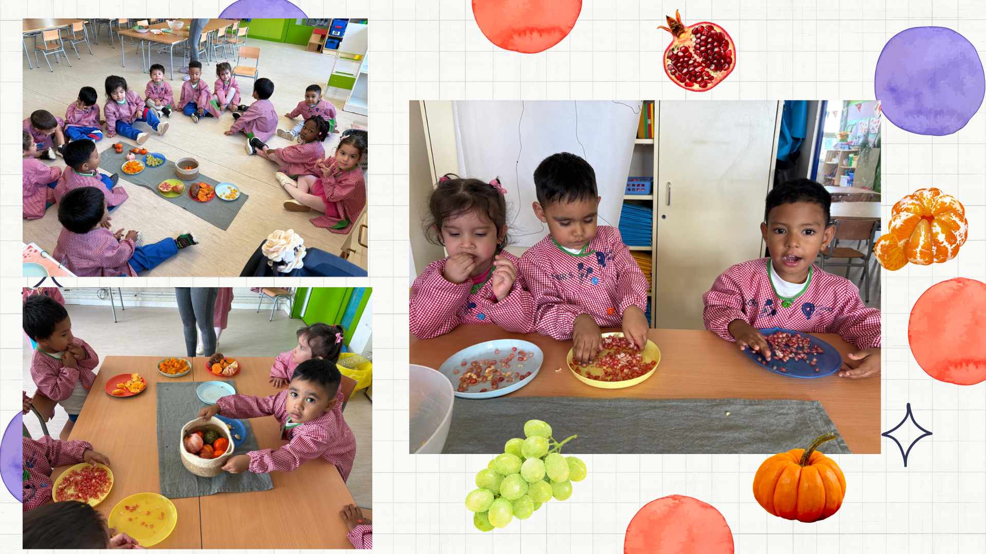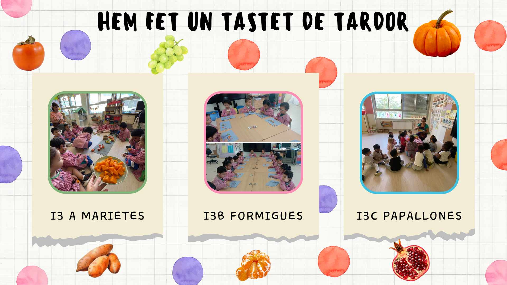 Ja s’acosta la festa de la castanyada i els infants d’I3 han gaudit d’un tastet de tardor, hem pogut tastar aquells fruits que s’han anat presentant durant les darreres setmanes. El que més els ha agradat ha estat el raïm i la magrana, tot i que també han menjat carbassa, moniato, mandarina i caqui. Us continuarem compartint imatges sobre aquesta estació tan bonica. Que continuï la festa!