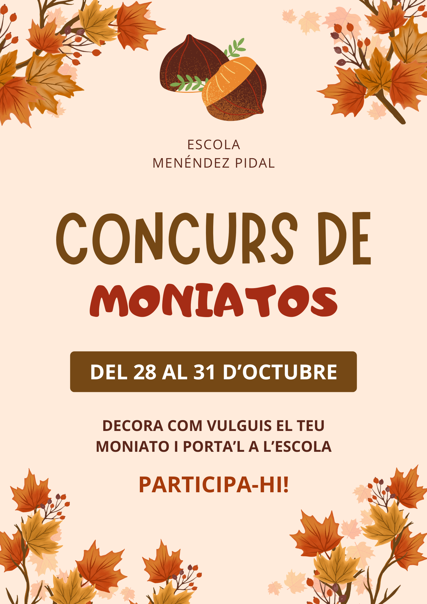 A més, tots els moniatos es presentaran en una exposició al vestíbul de l’escola perquè els pugueu veure. I no només això: els més destacats rebran una sorpresa! Animeu-vos a participar-hi, sigueu originals i divertiu-vos.