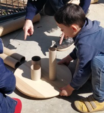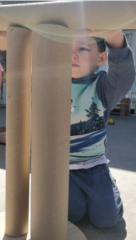 Aquests dies estem jugant i experimentant amb els cilindres, i comprovem que si estan tombats rodolen i, en canvi, si estan plantats per a què es moguin els hem d’empènyer… els dos costats plans que tenen no els deixen rodolar!
