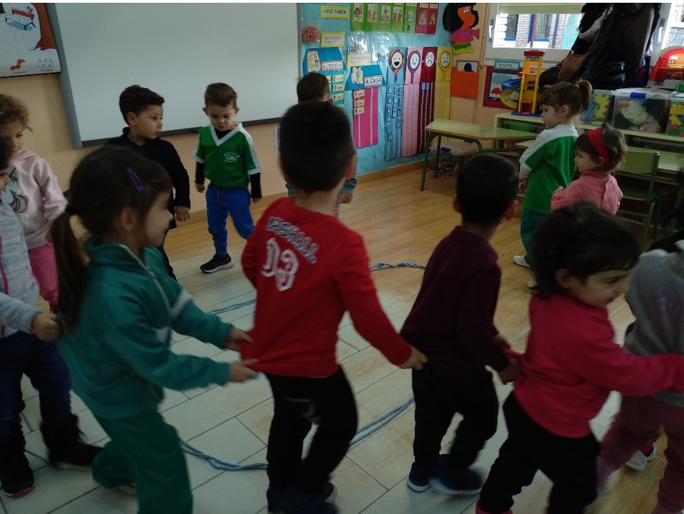Tots som peixets. Mentre que sona la música nedem en el mar, però si sentim una música terrorífica… és que ve un tauró que se’ns vol menjar. Aleshores hem de córrer i amagar-nos dins del cercle que hi ha al mig de la classe. És la nostra casa, però és petita i ens hem d’ajudar perquè hi capiguem tots junt i ens puguem salvar.