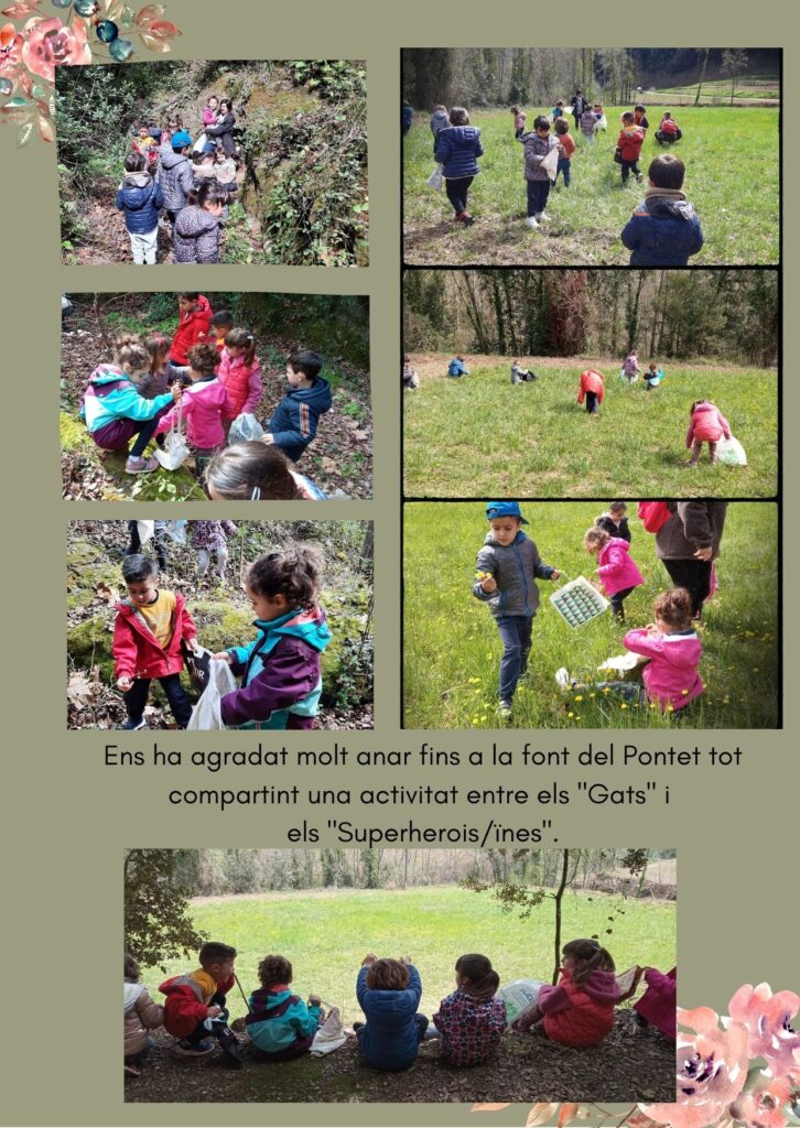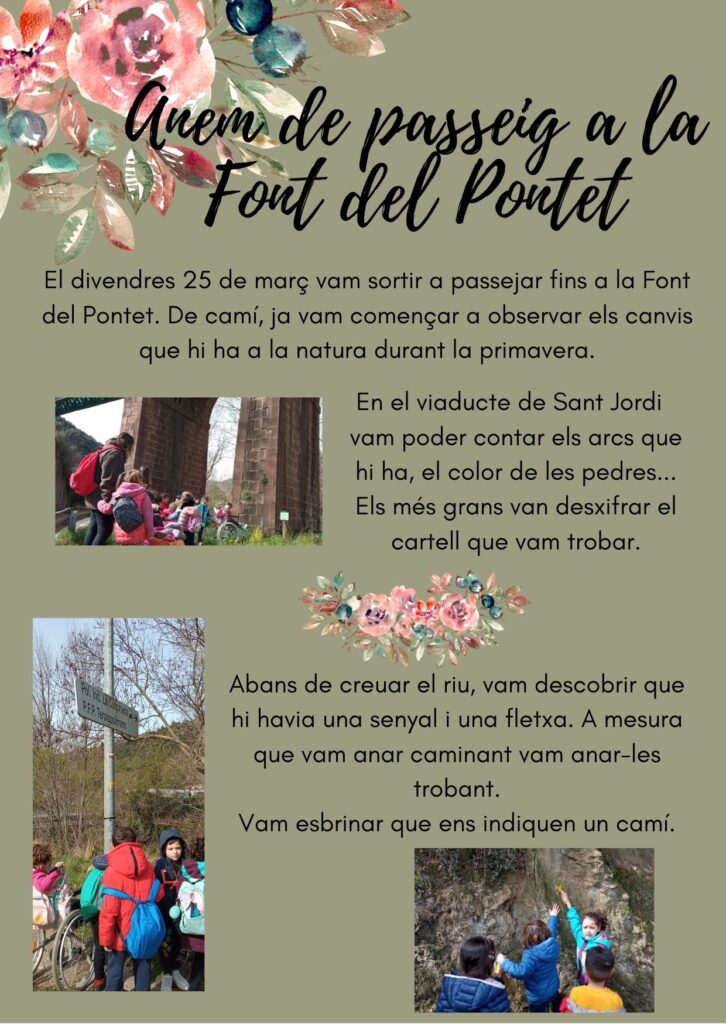 Anem a la Font del Pontet admin06/04/22 Els alumnes d’educació infantil hem anat a la Font del Pontet per observar els canvis de la natura a la primavera i a collir flors.