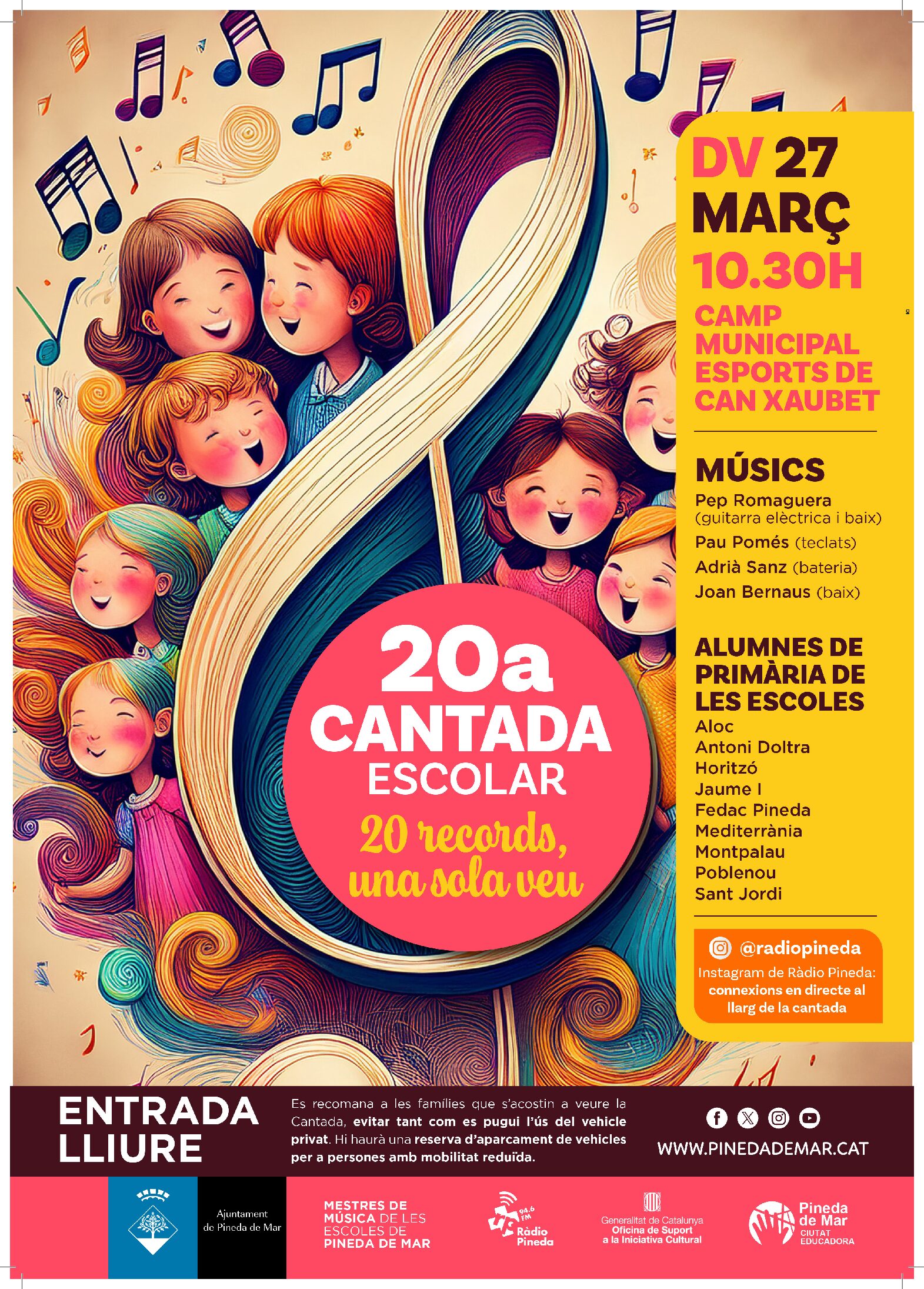 Aquest divendres 27 de març a les 10.30 h es celebrarà la 20a Cantada Escolar al Camp Municipal d’Esports de Can Xaubet, una trobada musical que reuneix l’alumnat de primària de diverses escoles del municipi.
