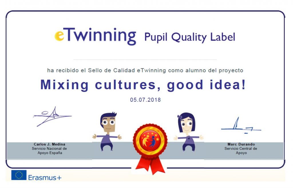 Per 3r any consecutiu l’escola ha estat atorgada amb el Segell de Qualitat Nacional i Europeu del projecte eTwinning que varem realitzar el curs passat un dels grups de 5è (actual 6èB) “Mixing cultures, good idea!“.