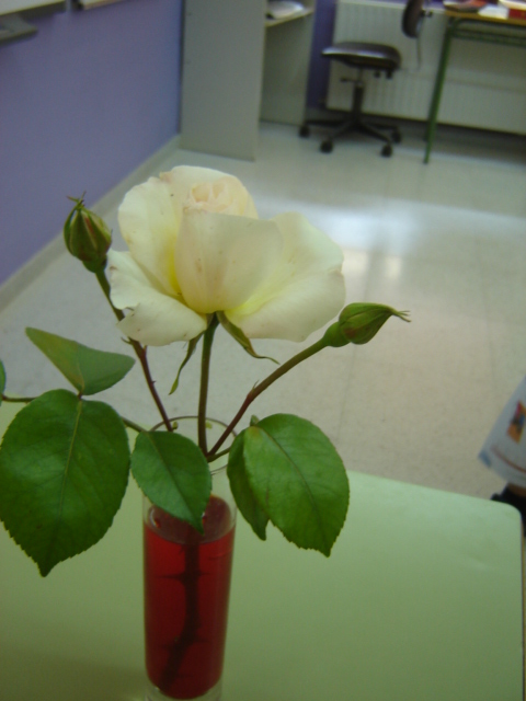 Estem treballant les plantes a diferents cursos i amb els alumnes de 5è hem fet un experiment al laboratori per veure com s’alimenten les plantes .Hem posat une flors blanques i unes branques d’api a dins uns gots amb aigua i tinta de color i les hem deixat durant uns dies en un lloc on els hi donés el sol.