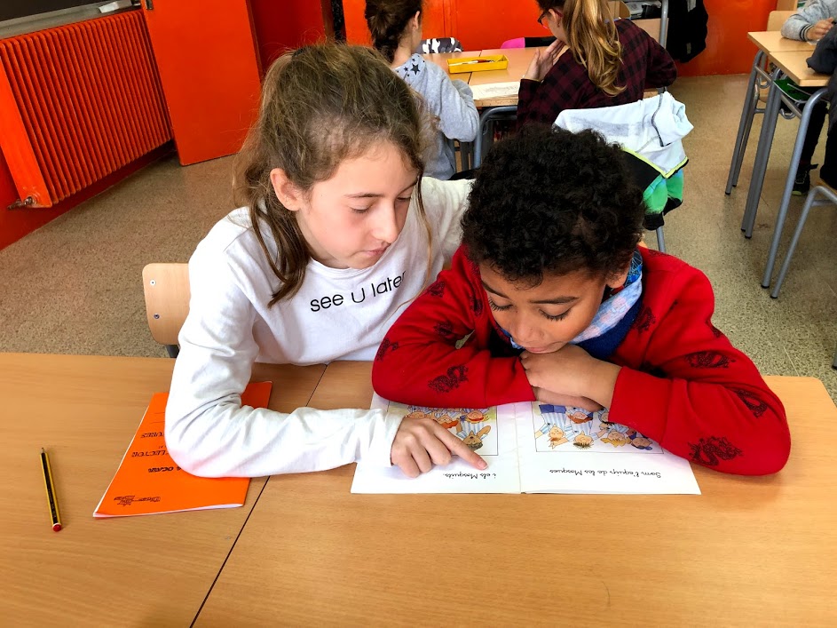 Els alumnes de cinquè ajuden als alumnes de primer amb la lectura. Es reuneixen una estoneta padrins-fillols i comencen a llegir i a conversar sobre la lectura. És un moment especial, en el que es crea un clima molt relaxant.