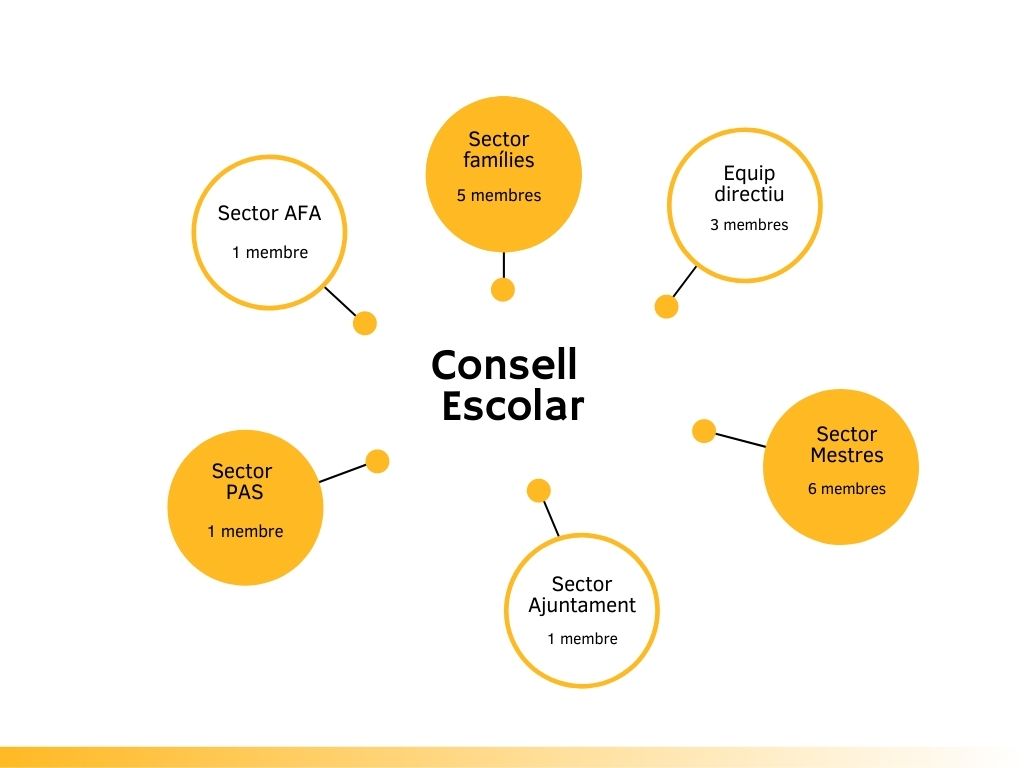 Hi estan representats tots els sectors de la comunitat educativa a excepció de l’alumnat. Professors/res, famílies, personal de serveis, l’Ajuntament.